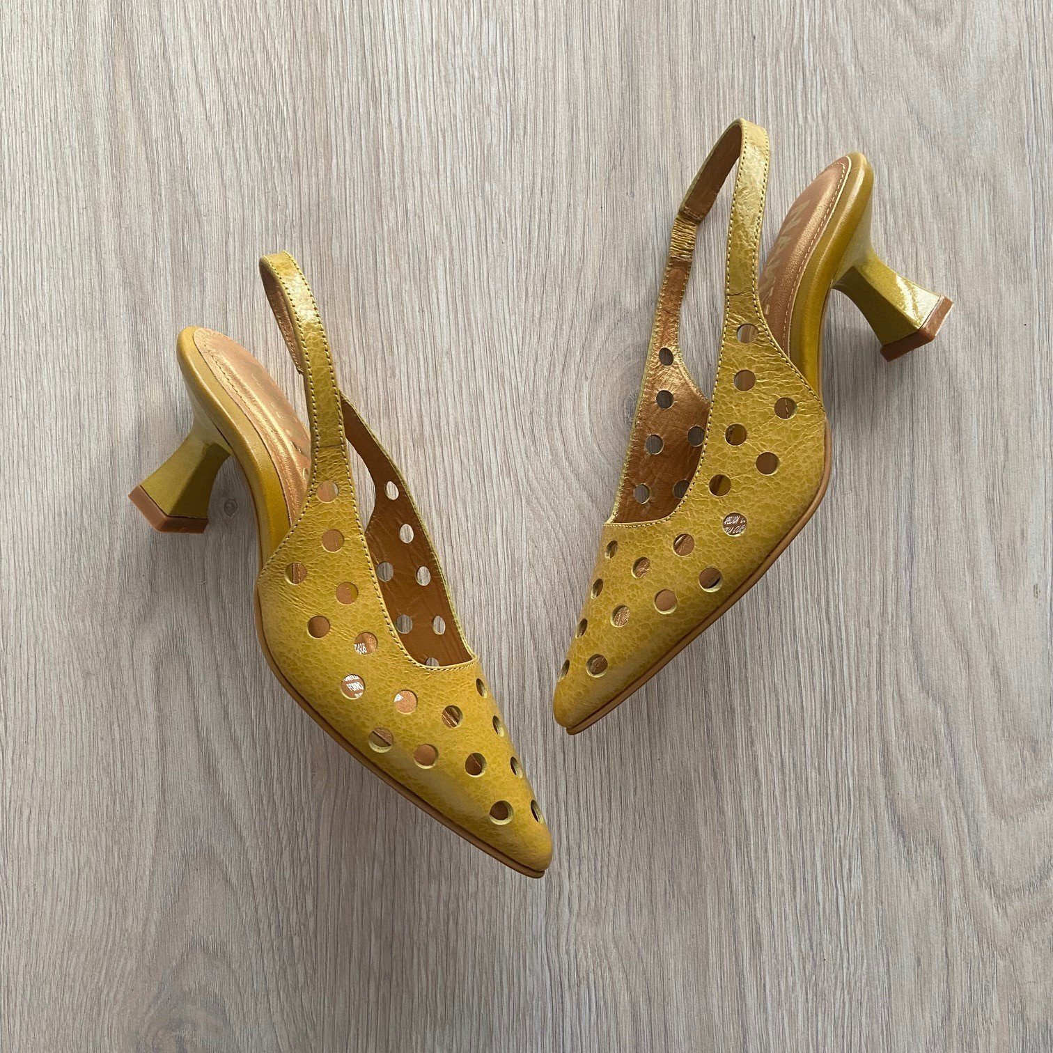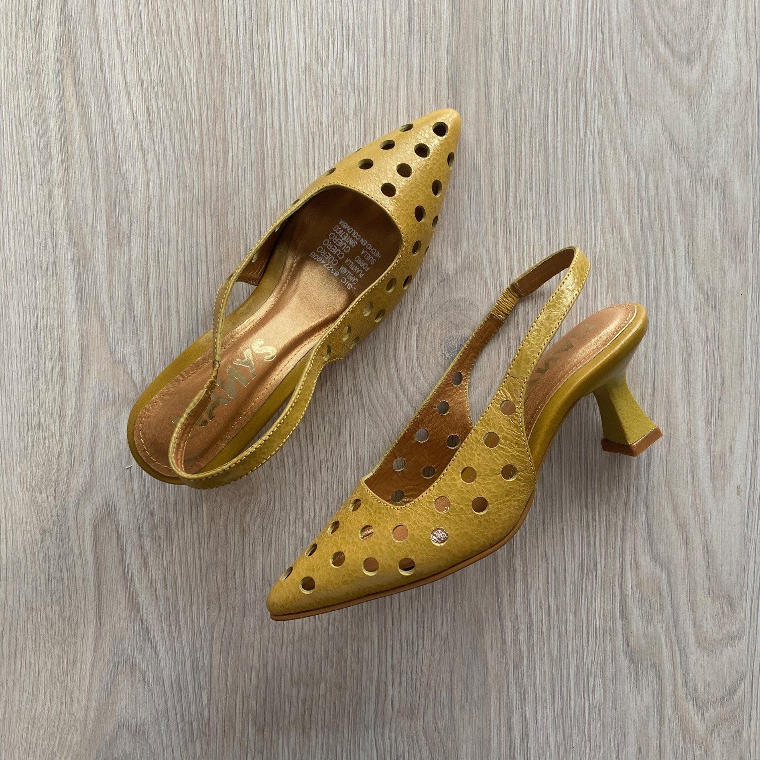 Zapato mostaza en cuero con roticos. Tacón 5.5 cm. Forrados en cuero. Hechos en Colombia,