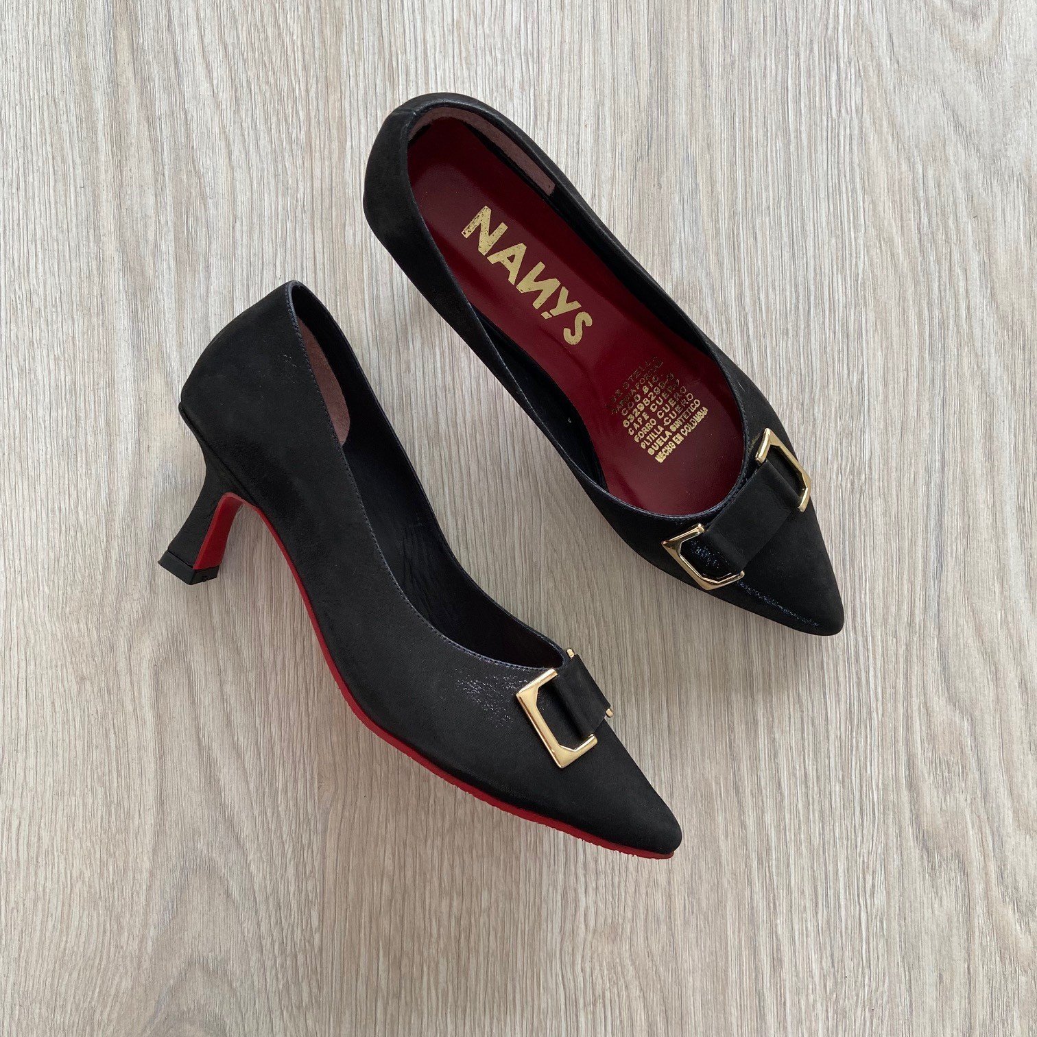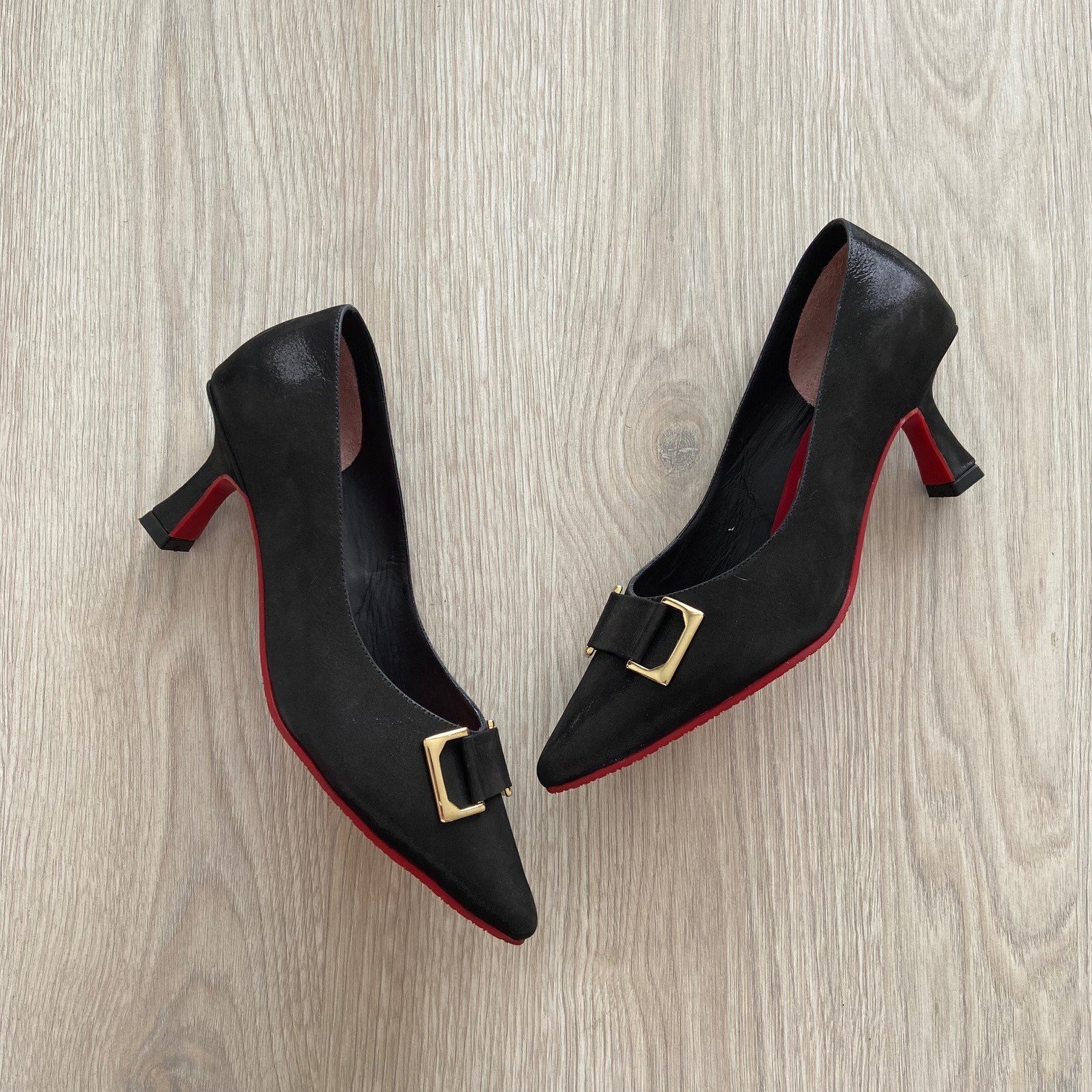 Zapato negro puntudo cerrado en cuero con herraje. Tacón 5.5 cm. Suela antideslizante roja. Forrados en cuero. Hechos en Colombia.