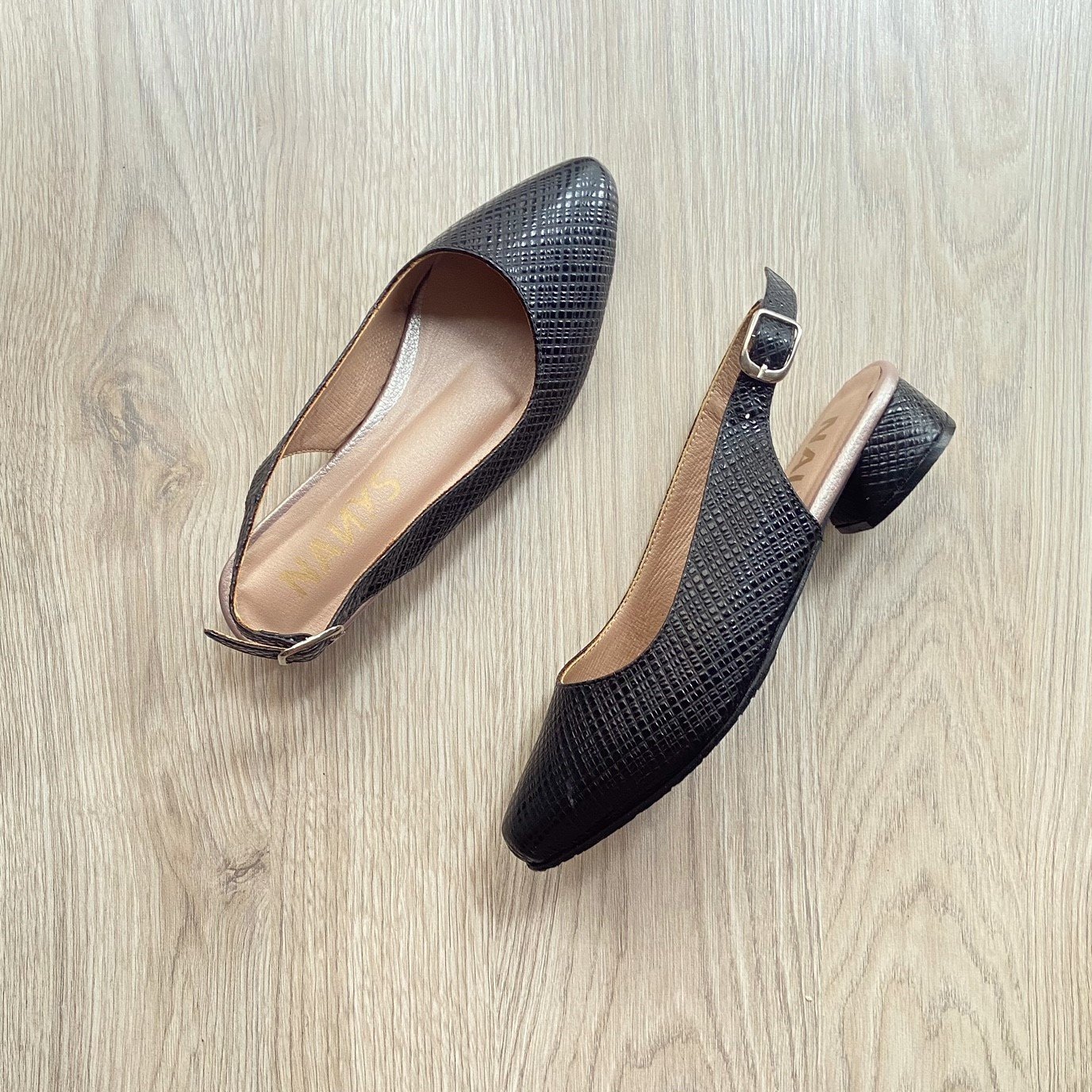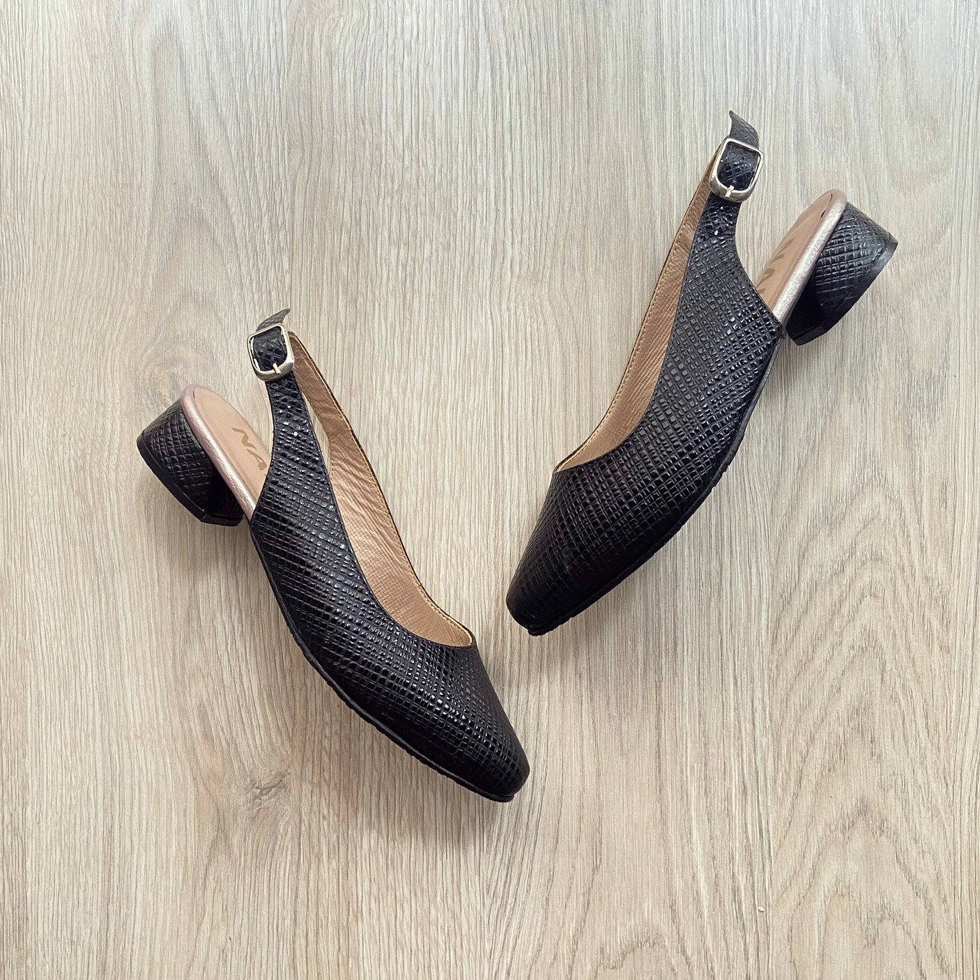 Zapato negro con oro rosa en cuero