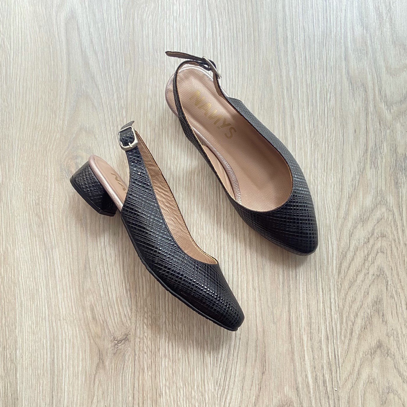 Zapato negro en cuero con banda oro rosa. Forrados en cuero. Tacón 2.5 cm. Hechos en Colombia. Disponible en color negro y talco.