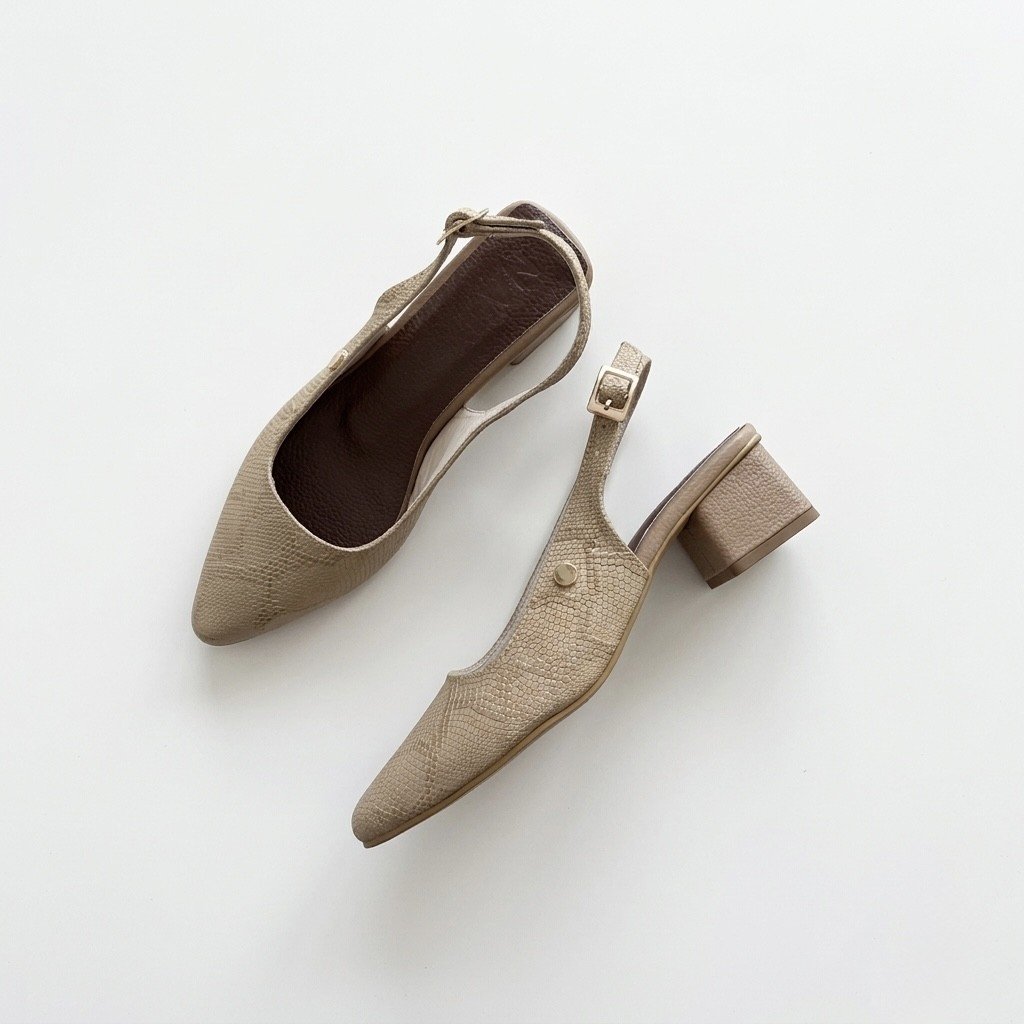 Zapato taupe en cuero tipo folia. Tacón 3.5. Con hebilla. Forrados en Cuero. Hechos en Colombia.