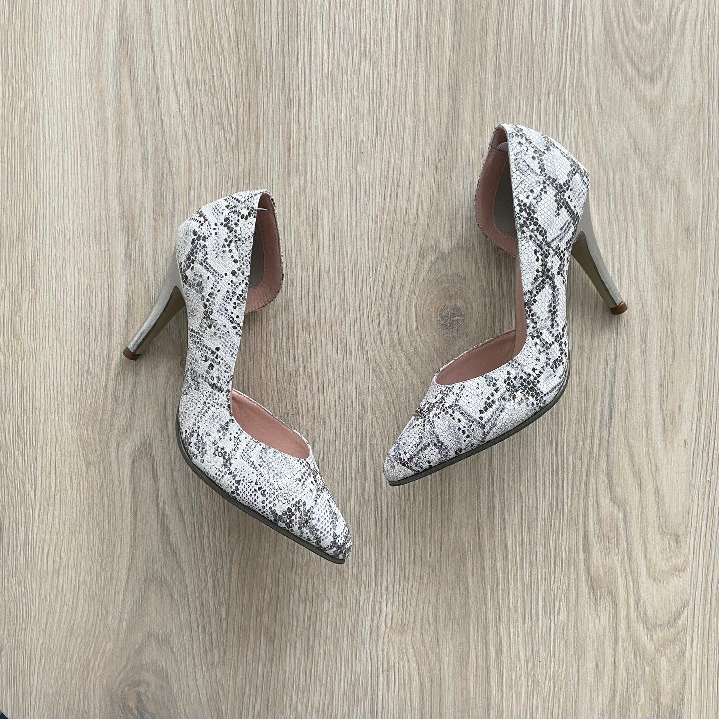 Zapato tipo estileto blanco en cuero tipo folia. Tacón 8.5 cm forrado en cuero plateado. Forrados en cuero. Hechos en Colombia.