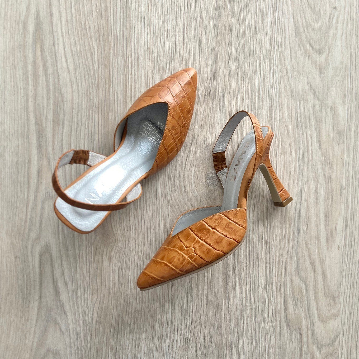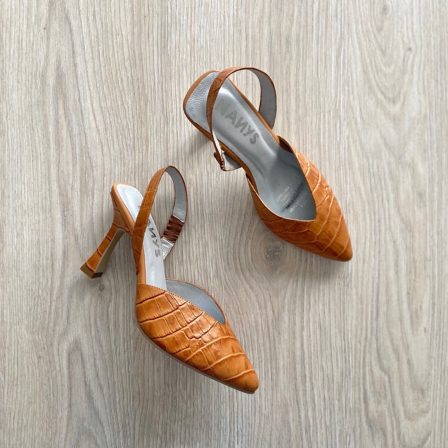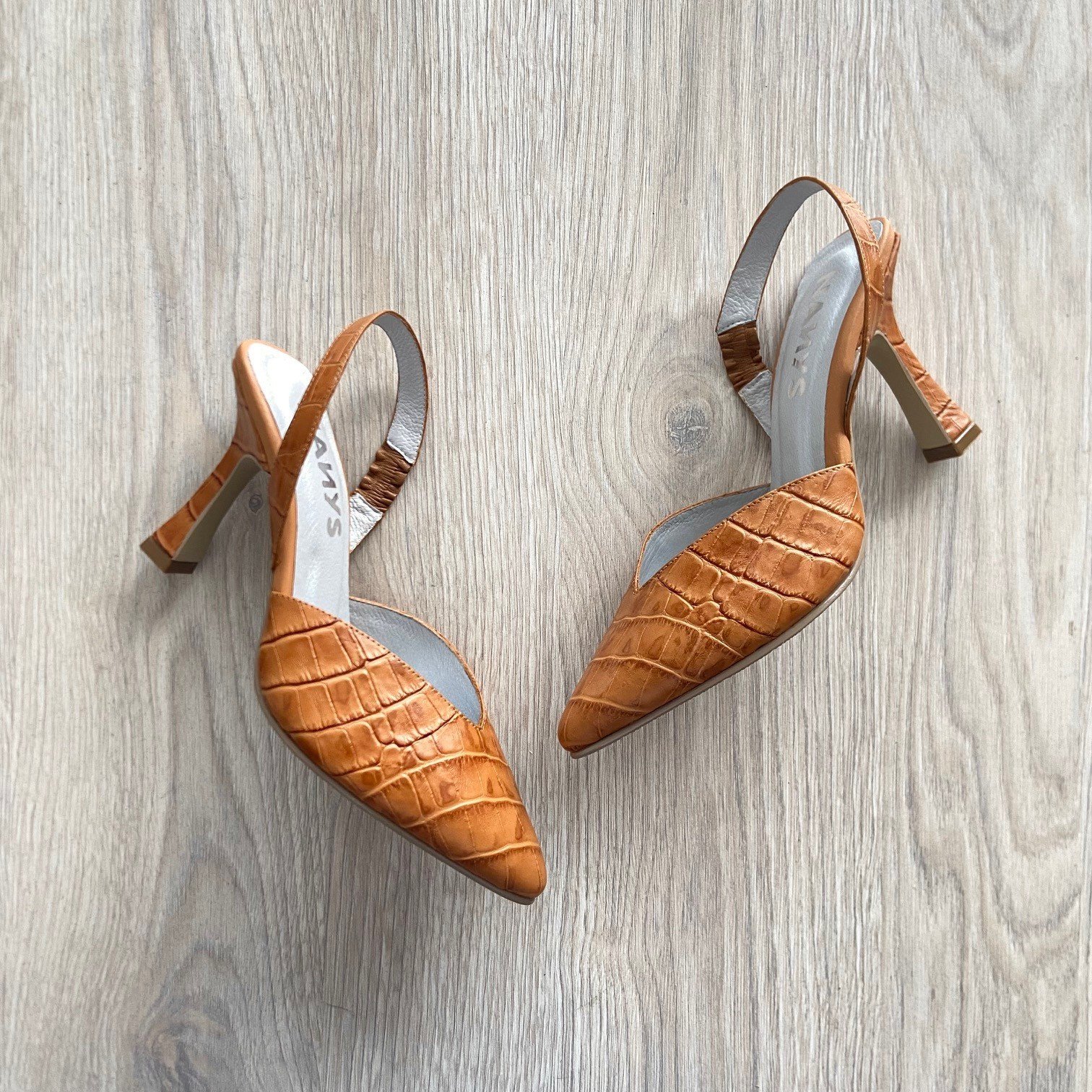 Zapatos altos miel en cuero tipo estiletos puntudos. Tacón delgado 7.5. Forrados en cuero. Hechos en Colombia.