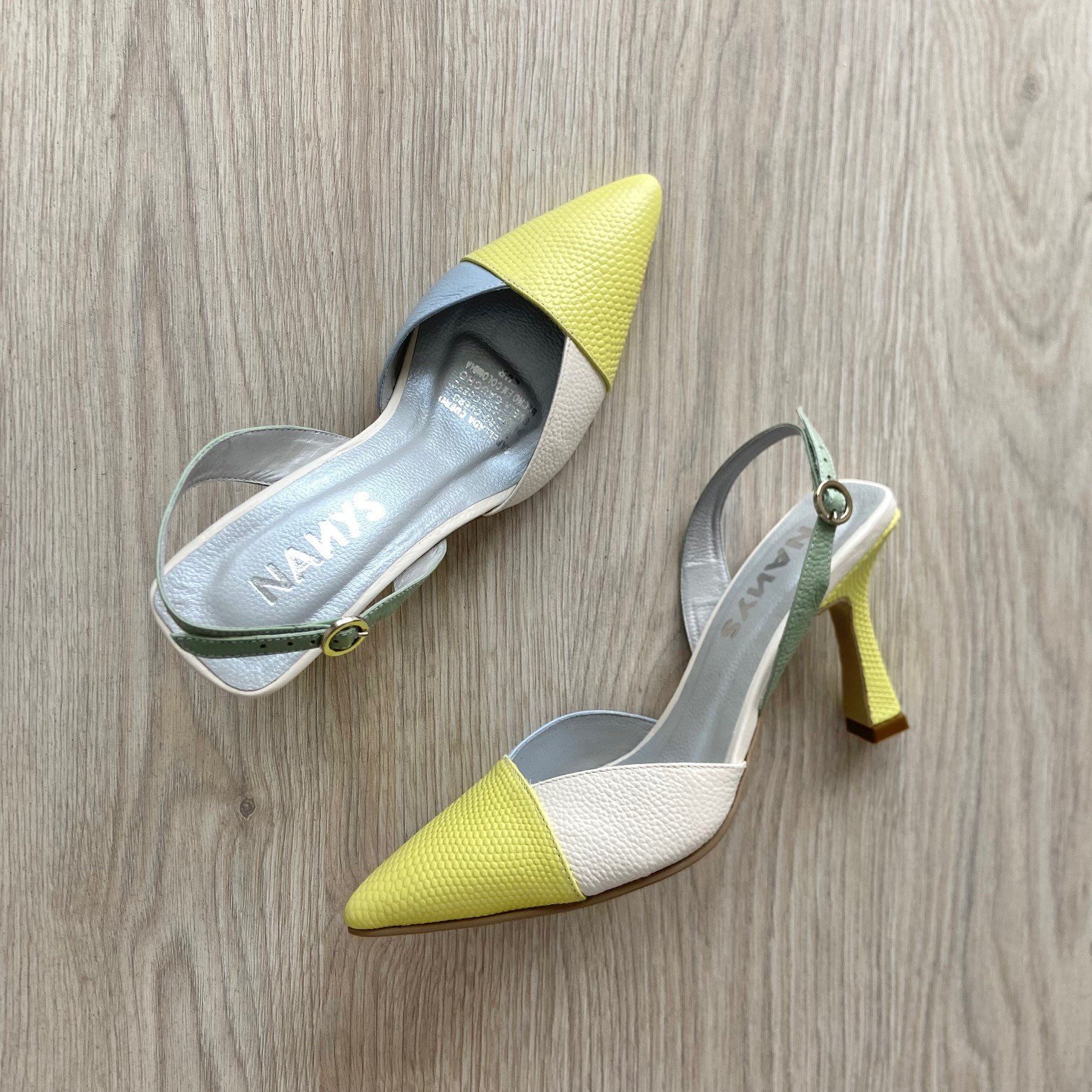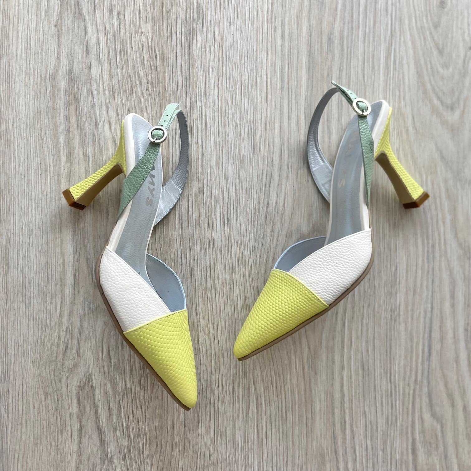 Zapatos amarillos con verde, talco y azul en cuero
