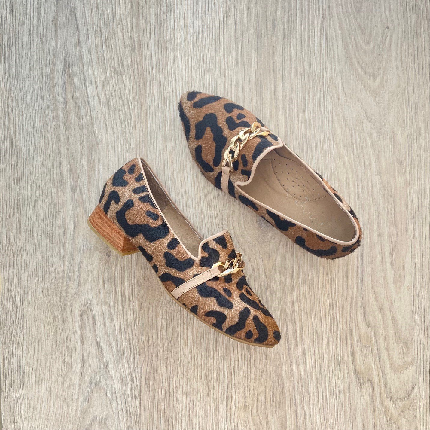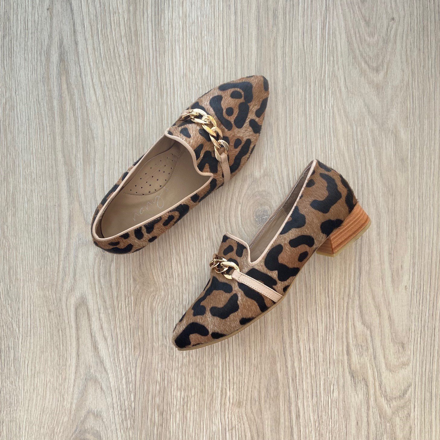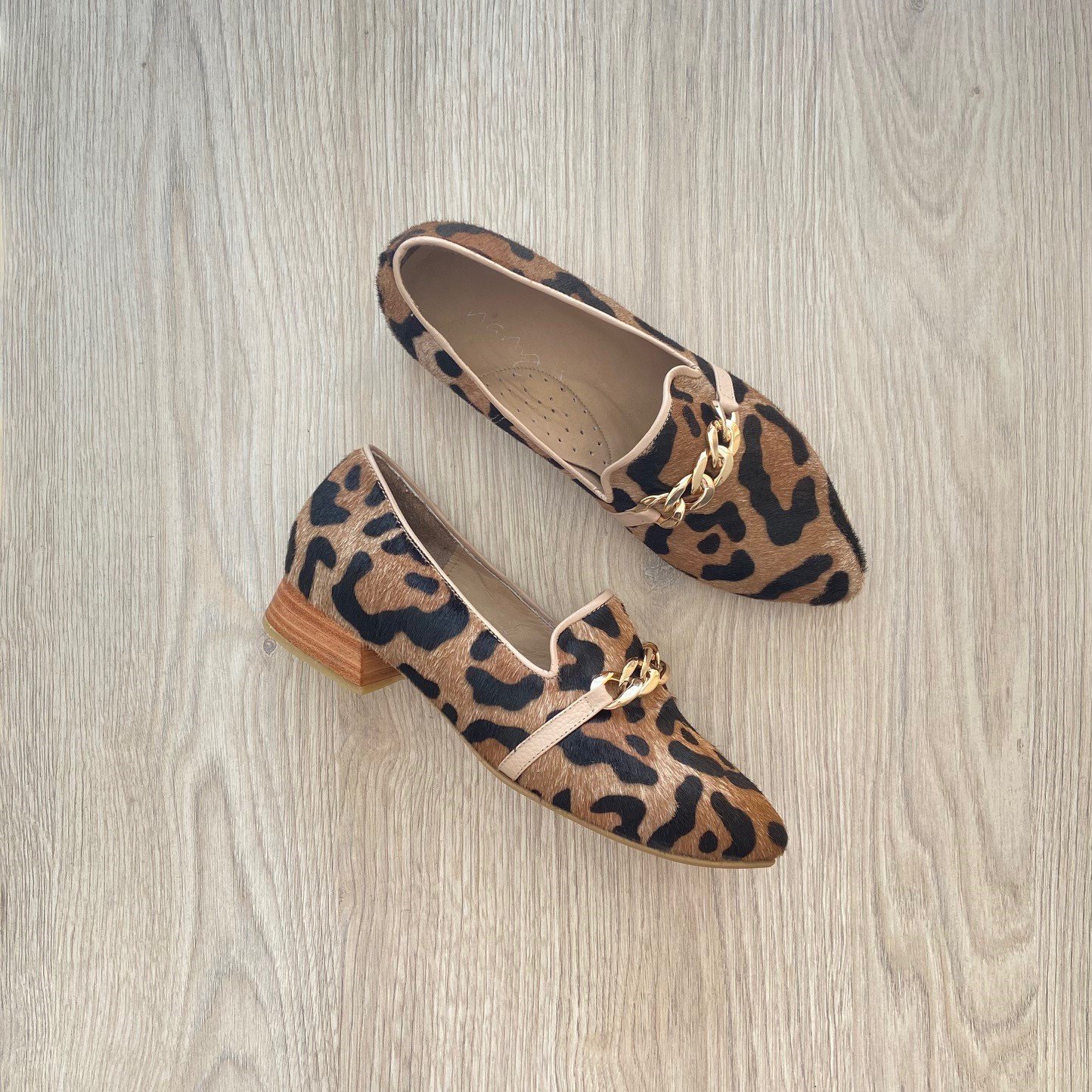 Zapatos animal print en cuero peludo con herraje dorado. Tacón 2.5 cm. Forrados en cuero. Hechos en Colombia.