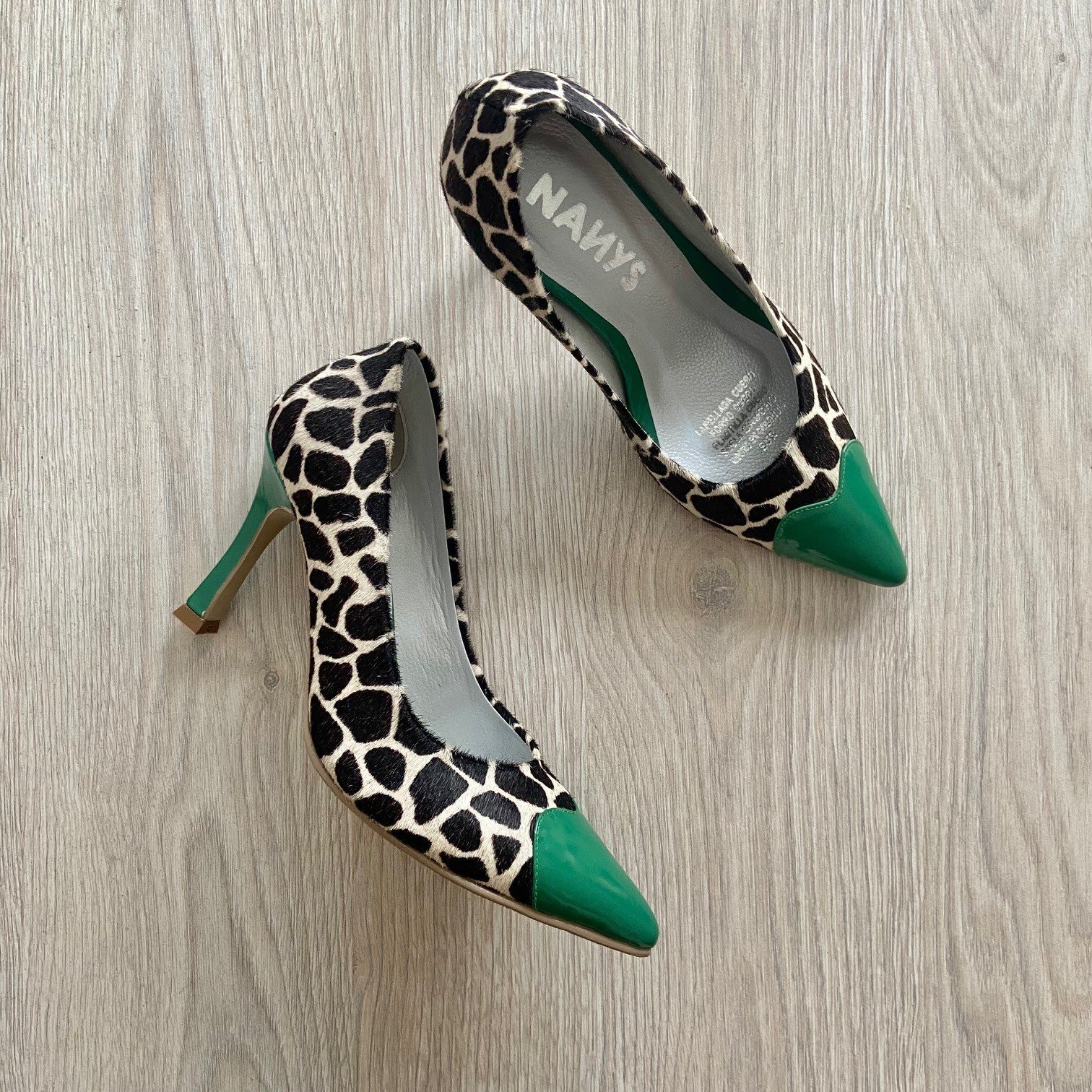 Zapatos animal print jiraja con verde en cuero peludo. Tacón 7.5. Forrados en cuero. Hechos en Colombia.
