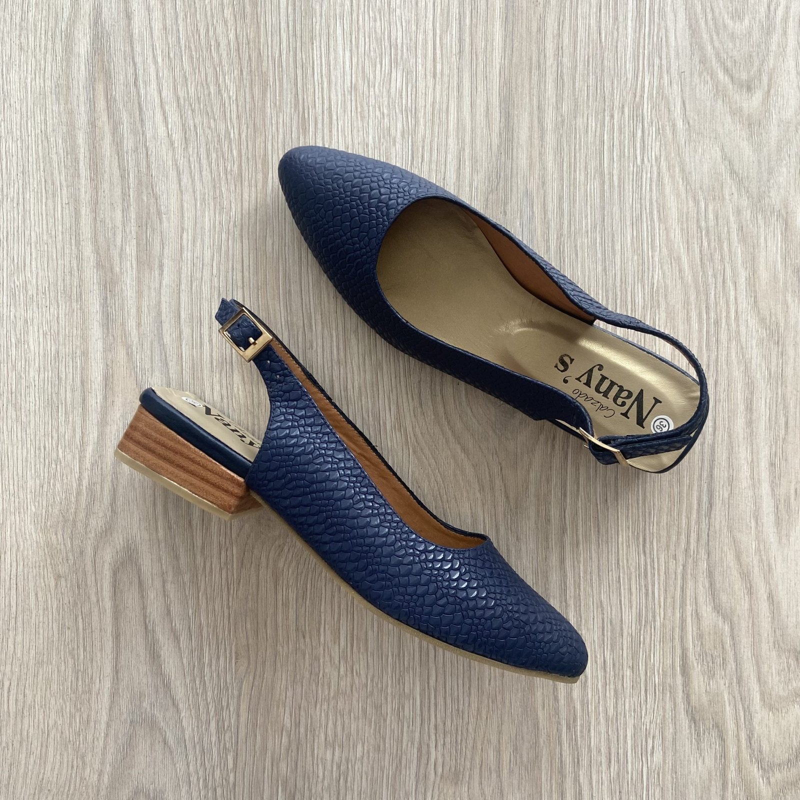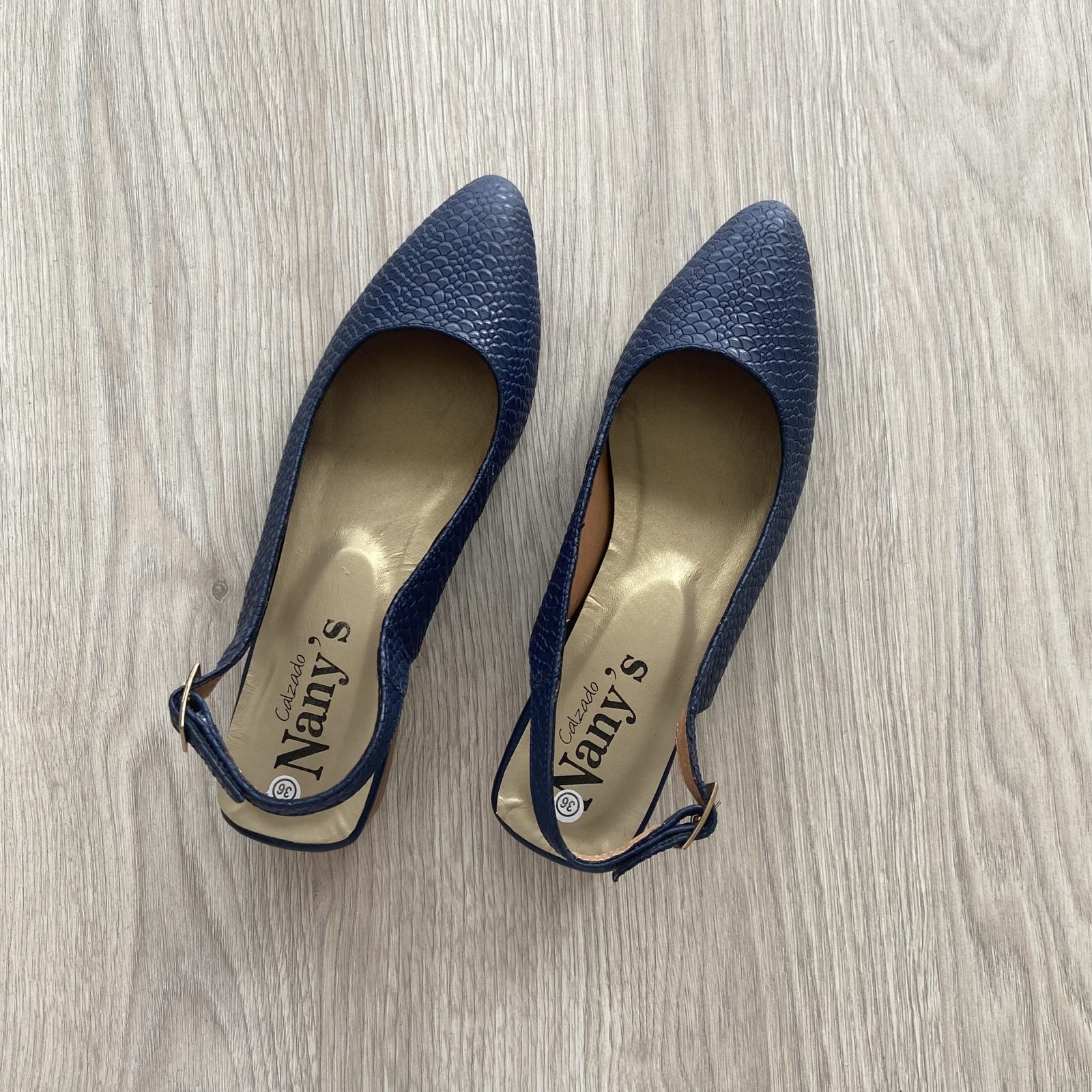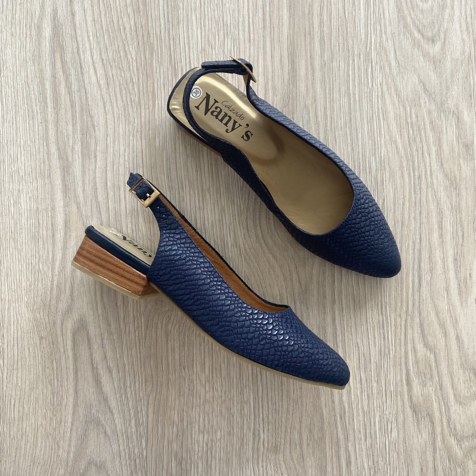 Zapatos bajitos azules en cuero. Tacón 2.5 cm en vira. Suela en goma antideslizante. Con hebilla. Forrados en cuero. Hechos en Colombia.