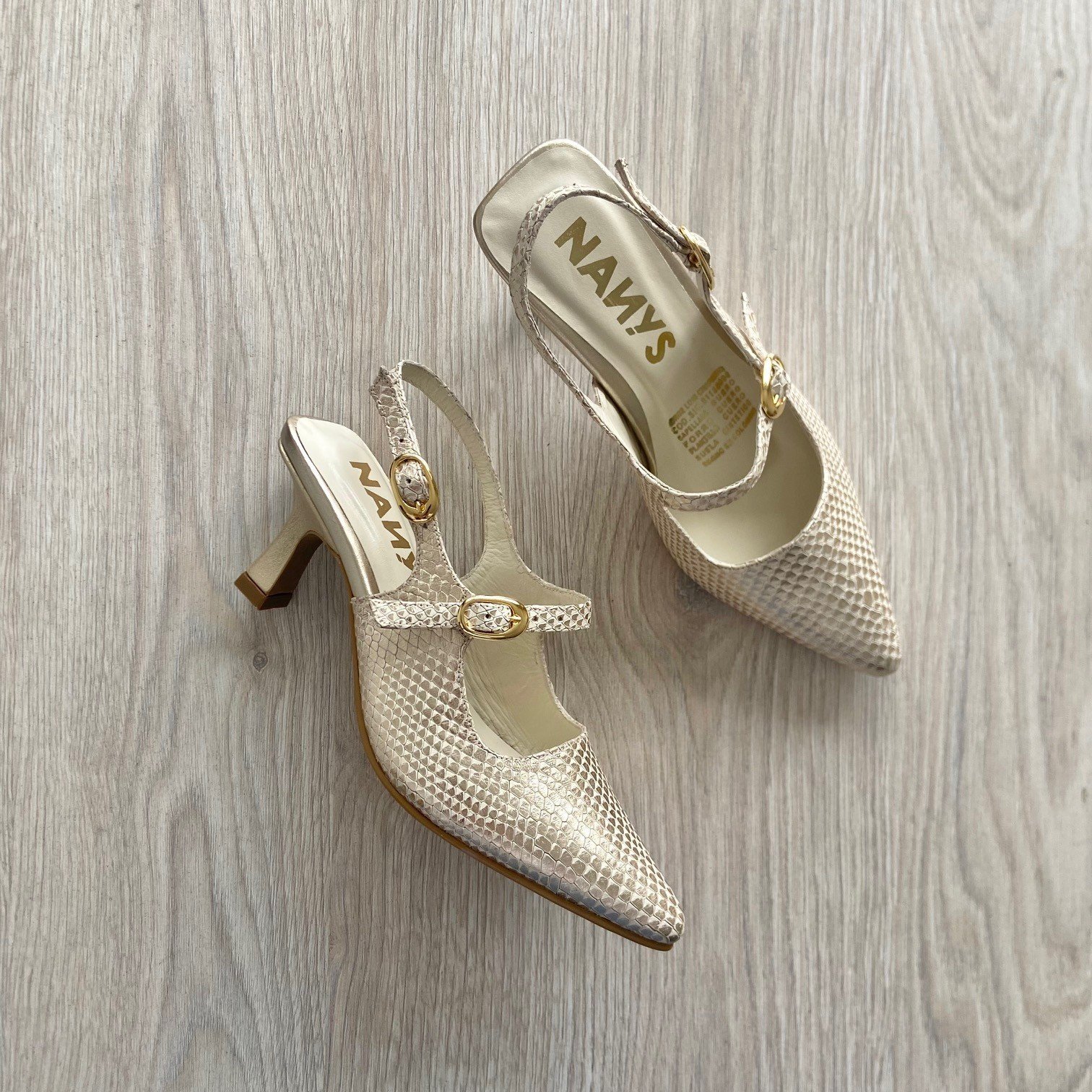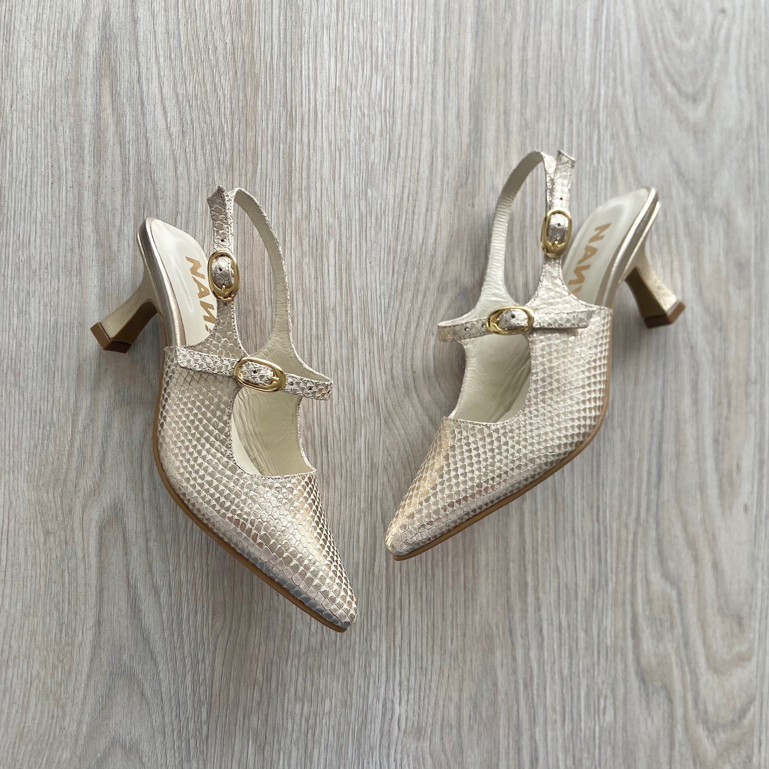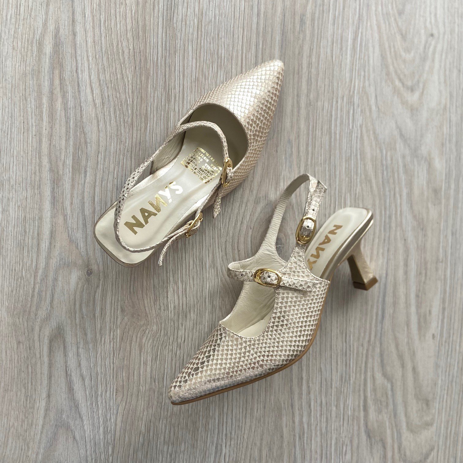 Zapatos beige con dorado en cuero. Con correas y hebillas. Tacón 5.5. Forrados en cuero. Hechos en Colombia.