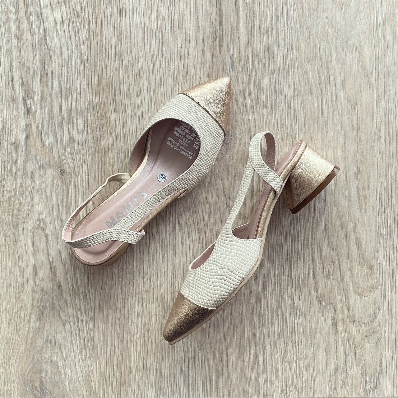 Zapatos blancos con dorado en cuero. Tacón 3.5 cm. Forrados en cuero. Hechas en Colombia.