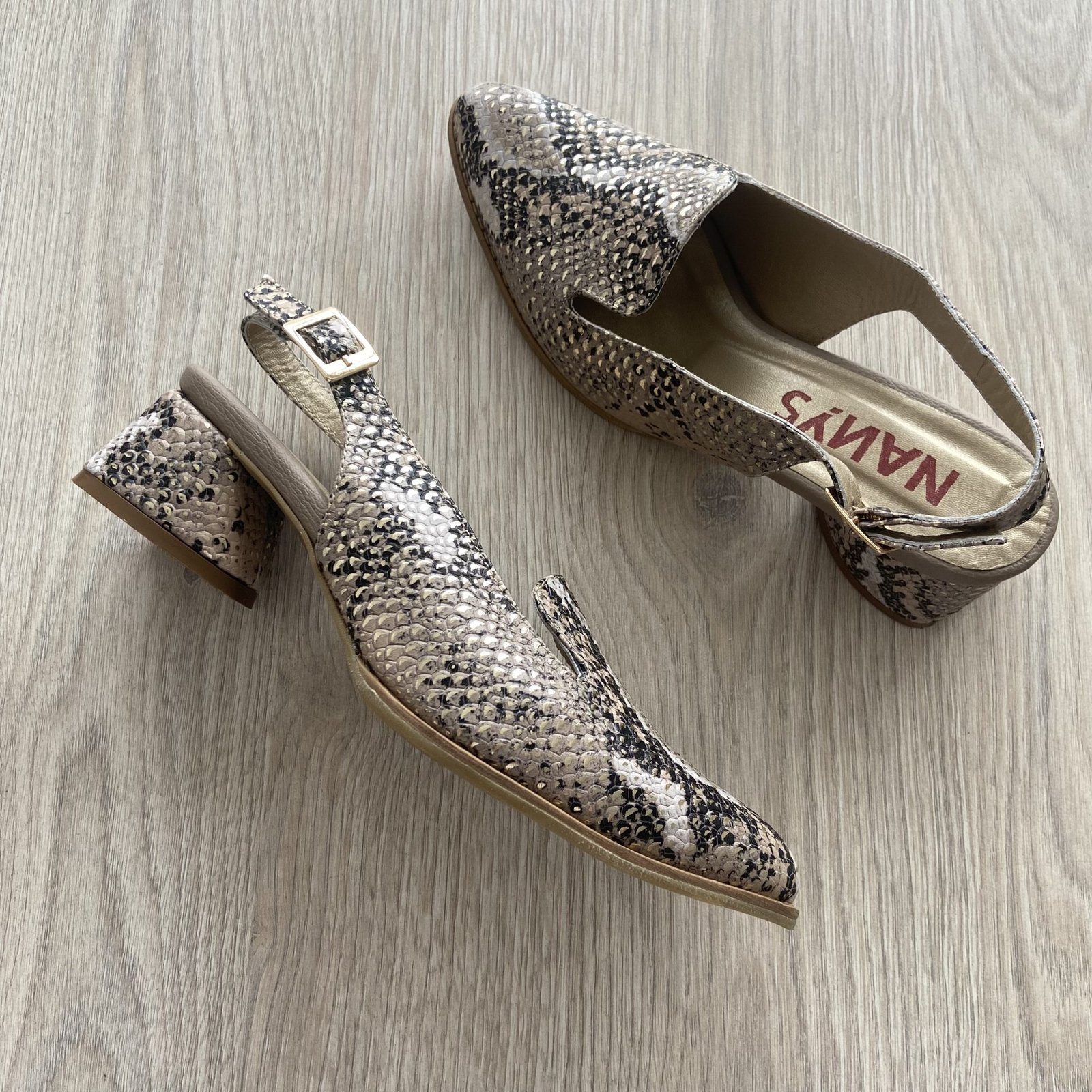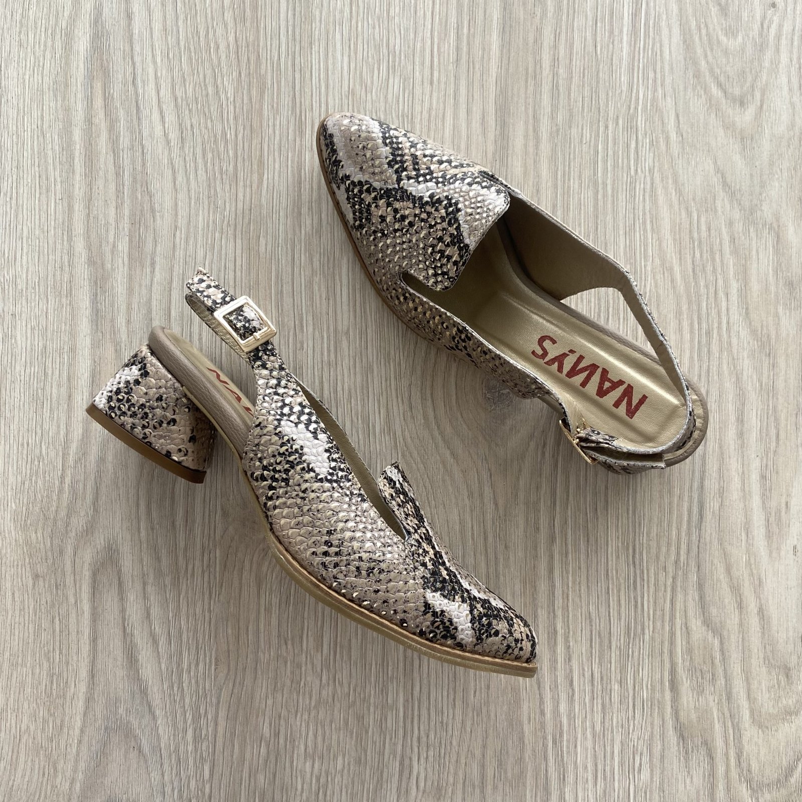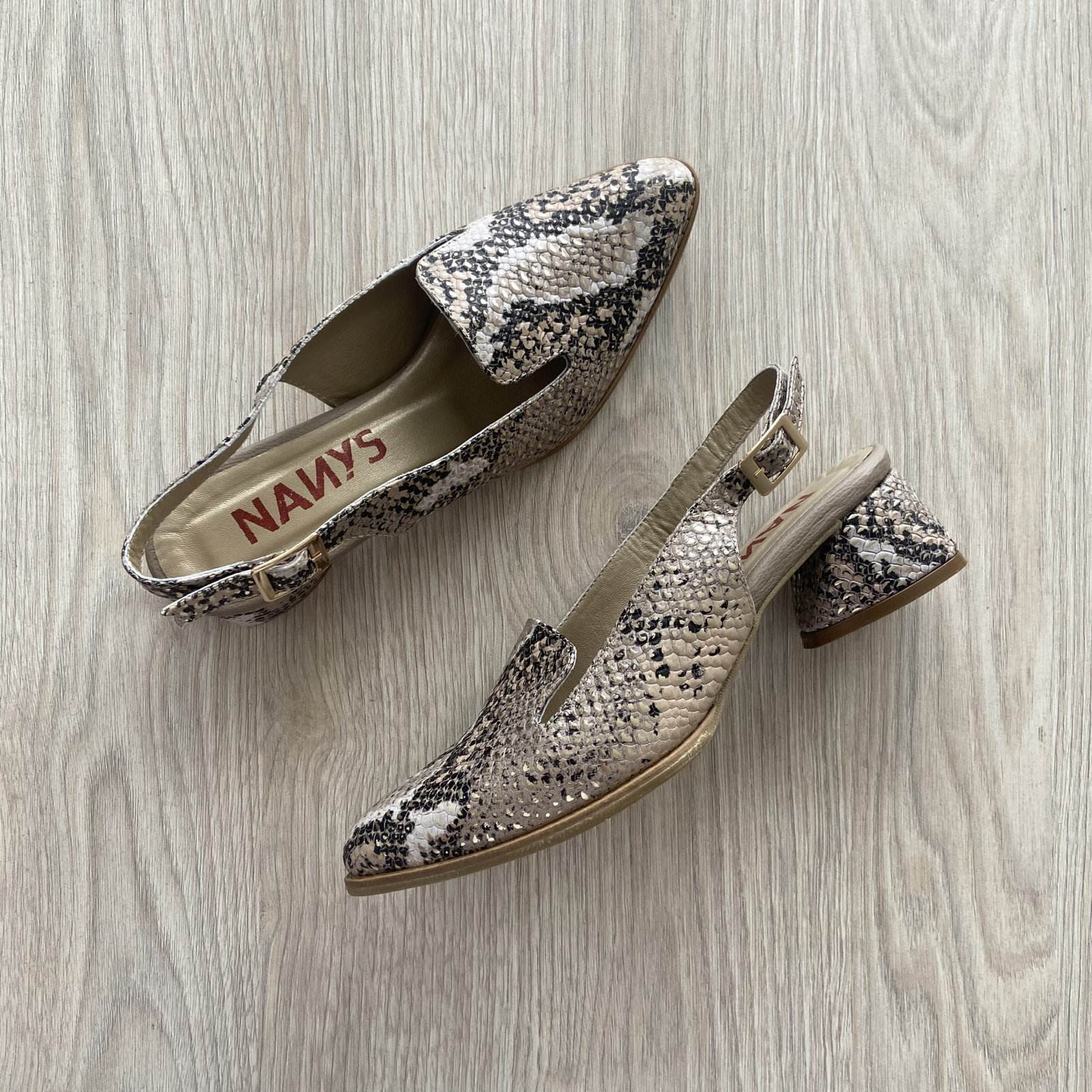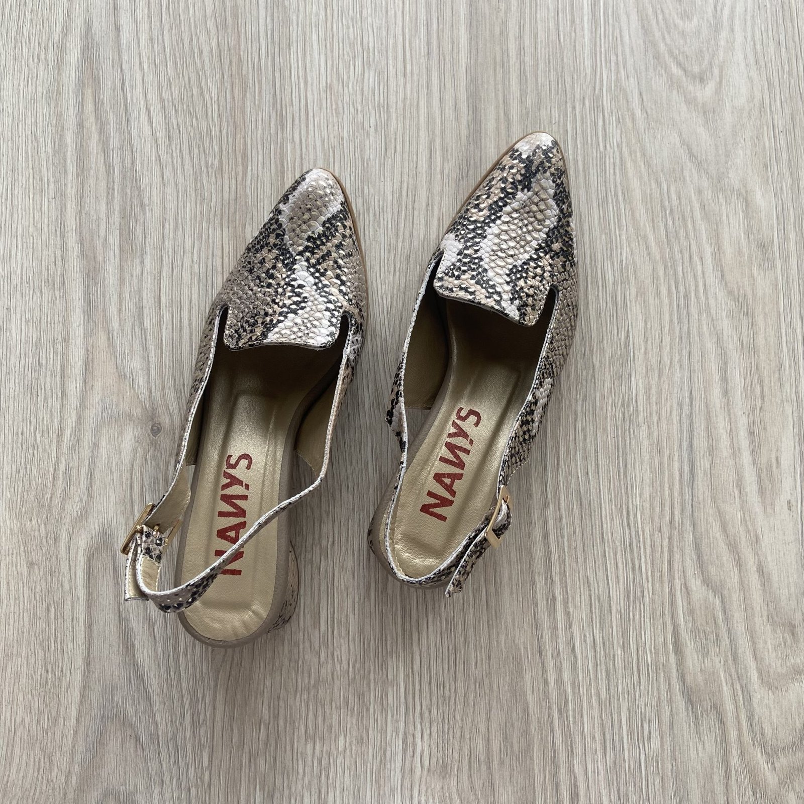 Zapatos bronce, beige y talco en cuero tipo folia. Tacón 3.5 cm. Forrados en cuero. Hechos en Colombia.