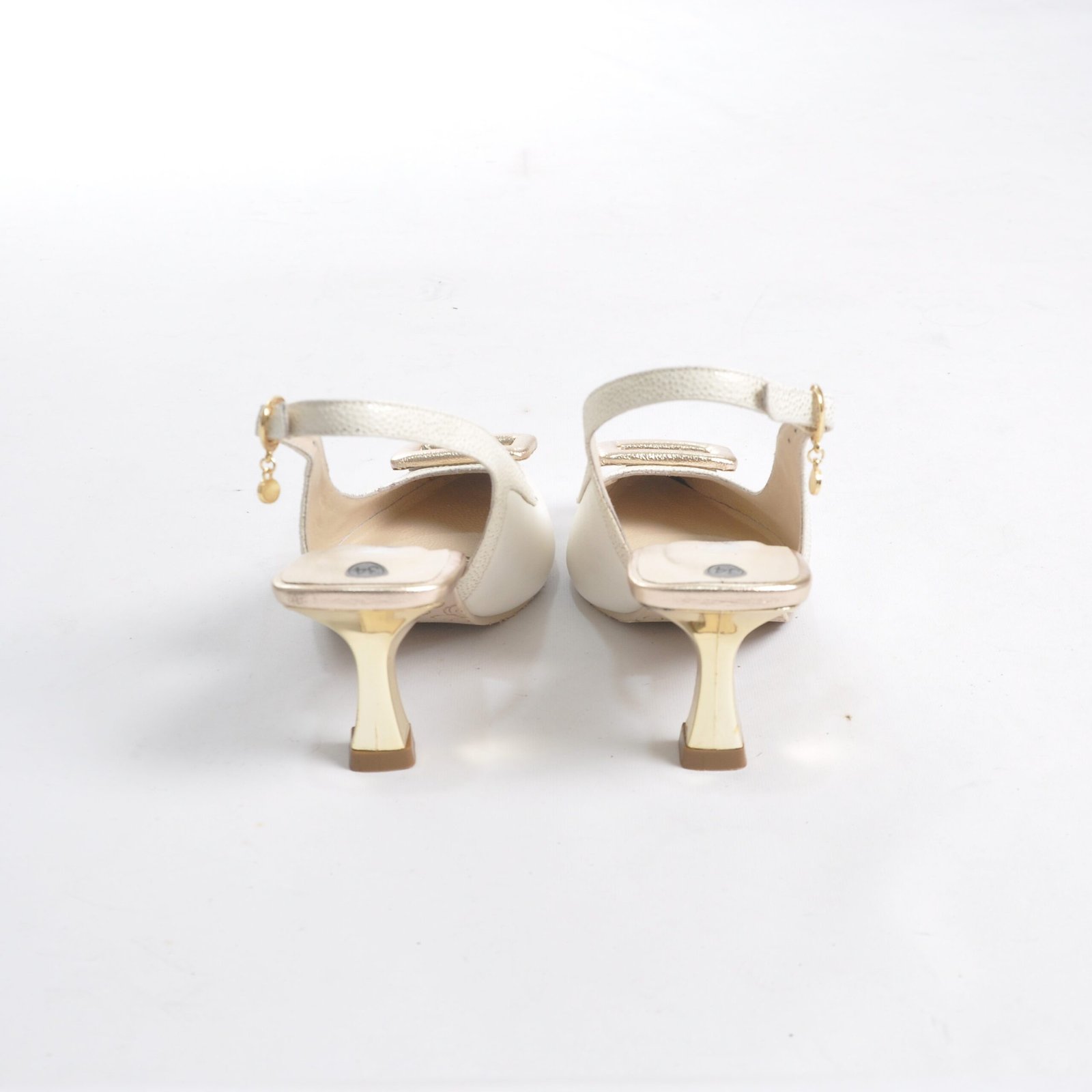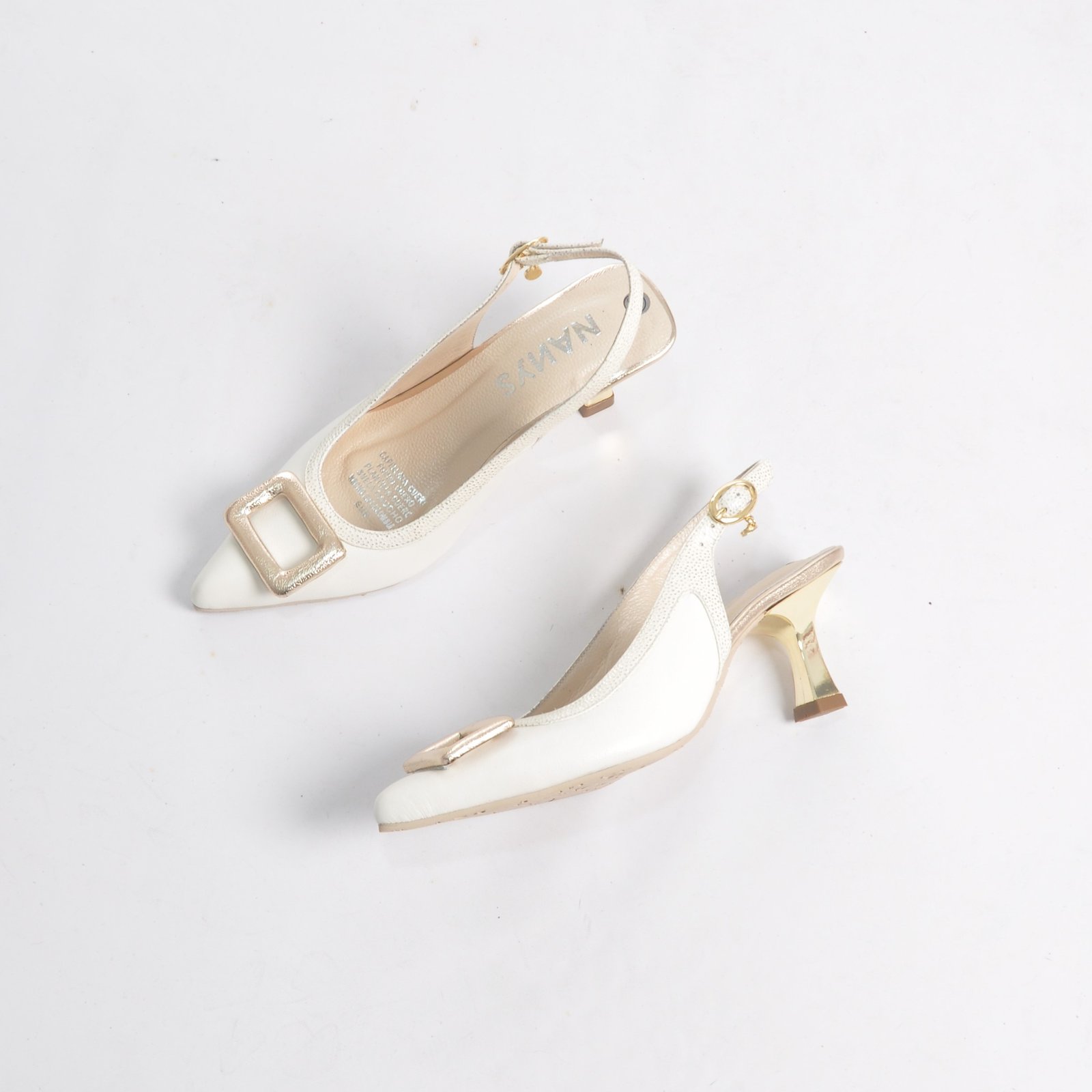 Zapatos clásicos talco con dorado en cuero. Tacón 5.5. Con hebilla. Forrados en cuero. Suela en goma. Hechas en Colombia.