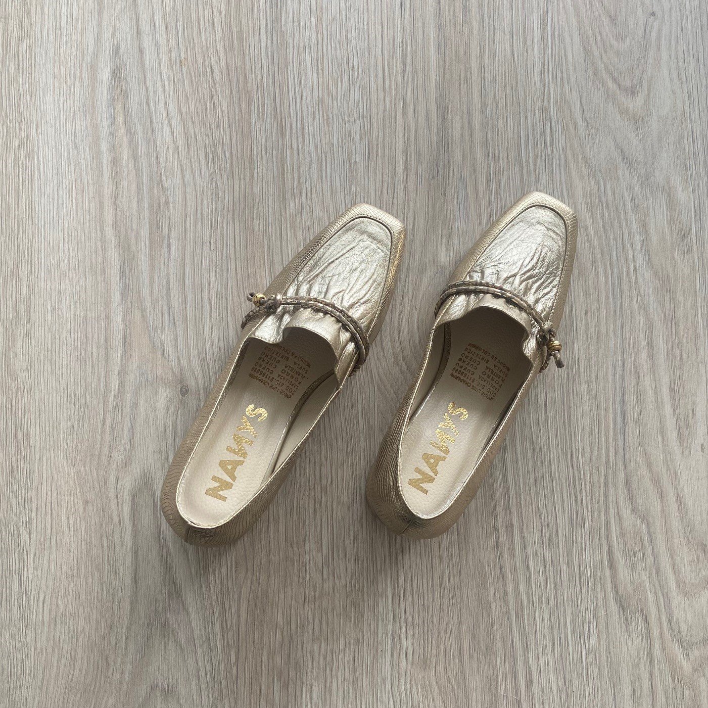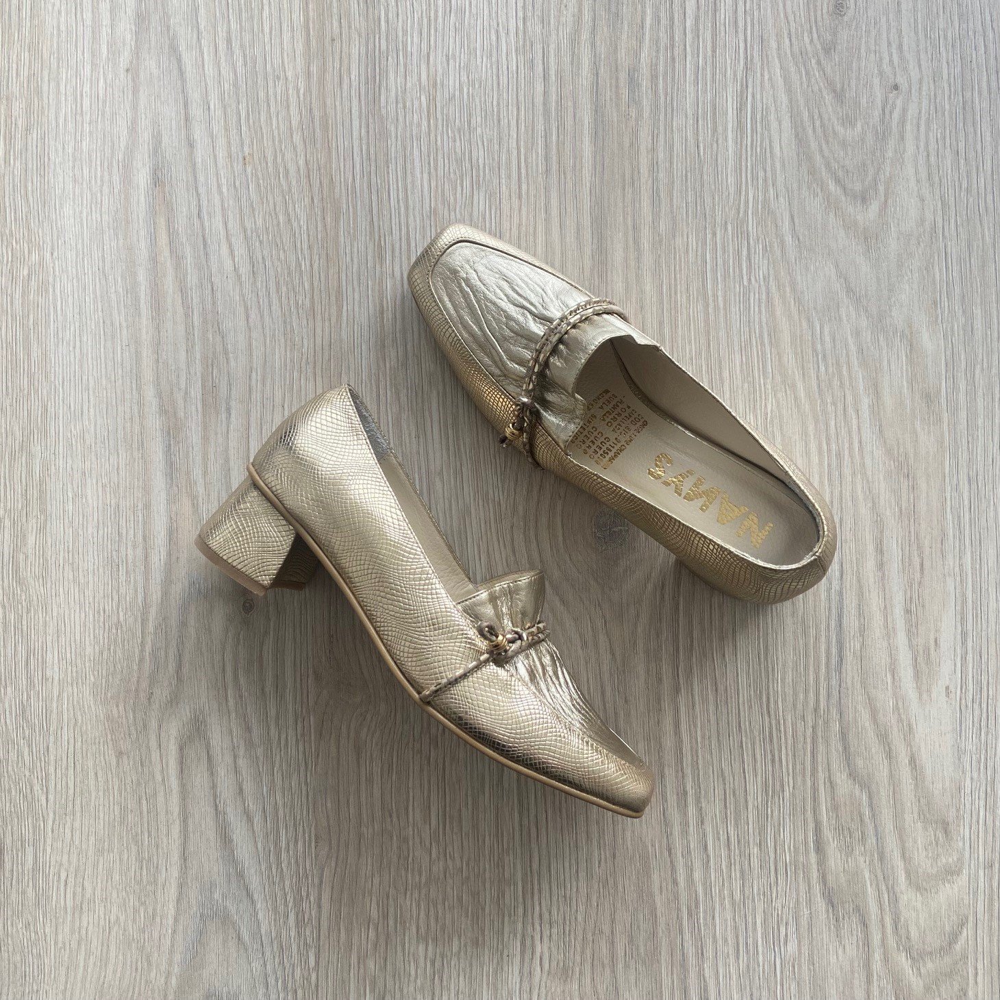 Zapatos dorado en cuero de punta cuadrada. Aplique de cordón en cuero en la capellada.  Tacón 3.5 cm. Forrados en cuero. Hechos en Colombia.
