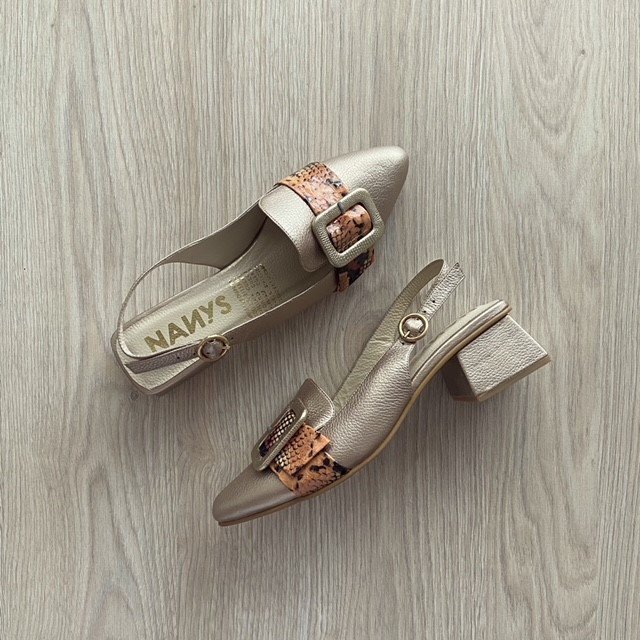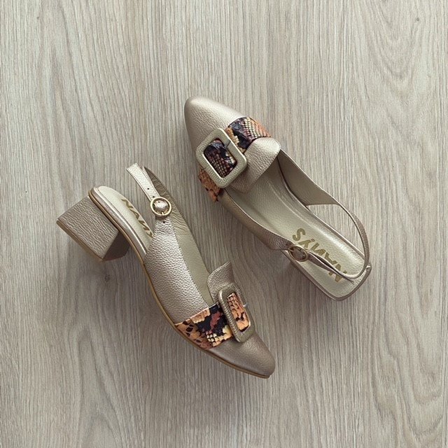 Zapatos dorados en cuero con hebilla en folia. Tacón 3.5 cm con tapa en goma. Forrado en cuero. Hecho en Colombia.