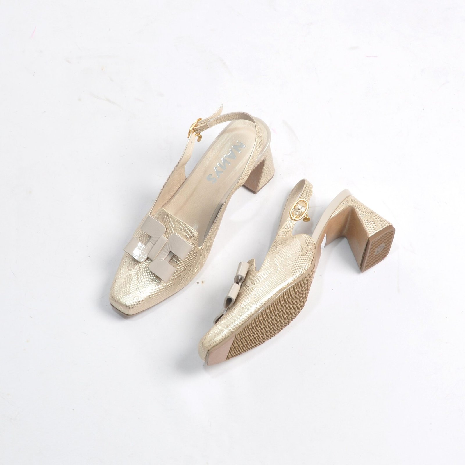 Zapatos dorados en cuero tipo folia con aplique en taupe charol. Tacón 5.5. Con hebilla. Forrados en cuero. Hechos en Colombia.