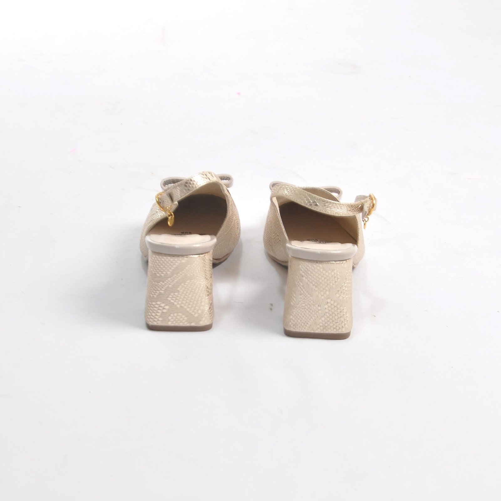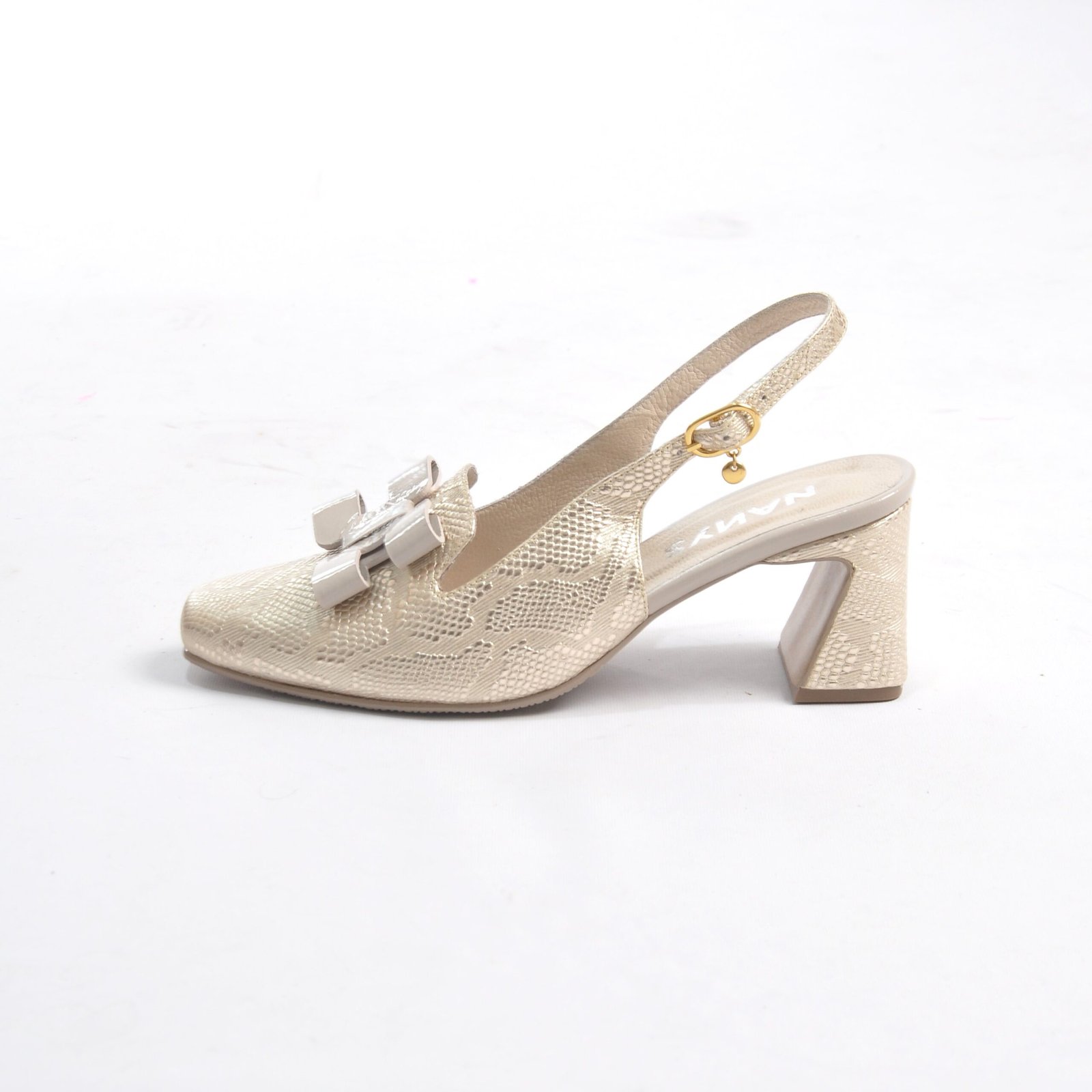 Zapatos dorados en cuero tipo folia con aplique en taupe