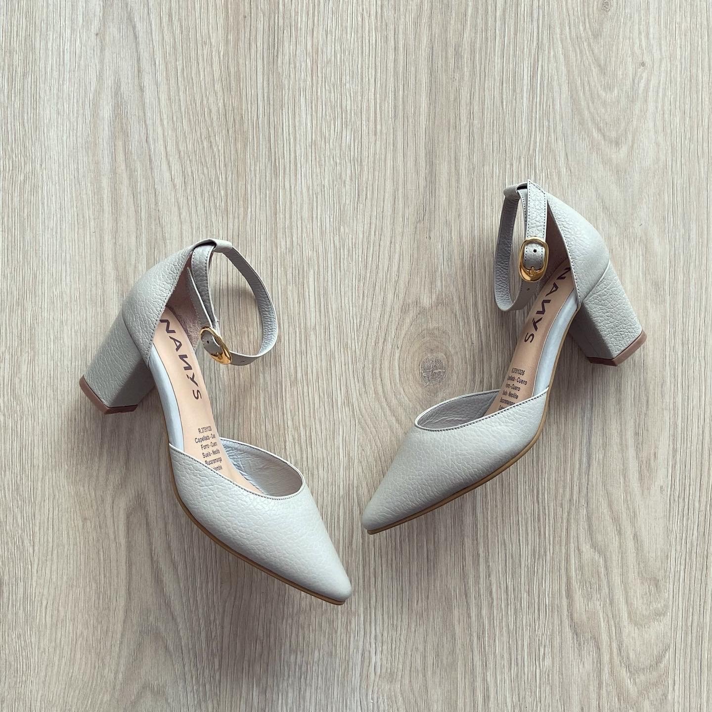 Zapatos grises en cuero con pulsera. Tacón 5.5 cm. Forrados en cuero. Hechos en Colombia.