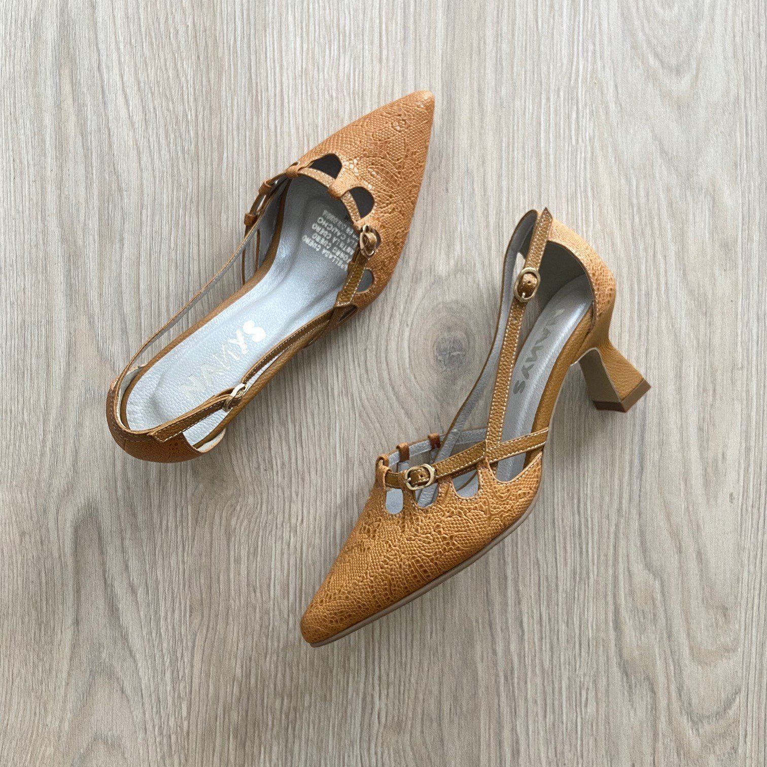 Zapatos miel en cuero grabado y liso. Con talonera. Tacón 5.5. Forrados en cuero. Hechos en Colombia.