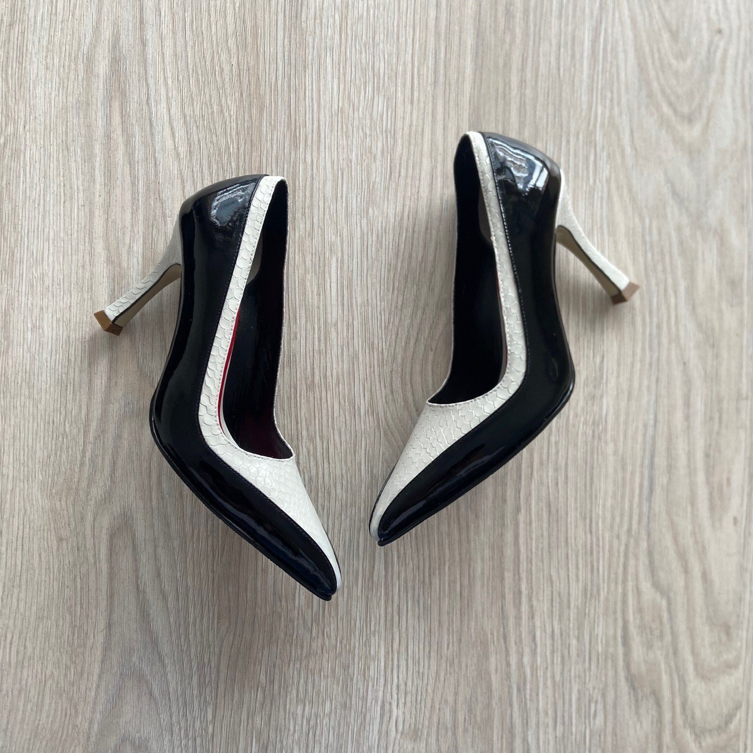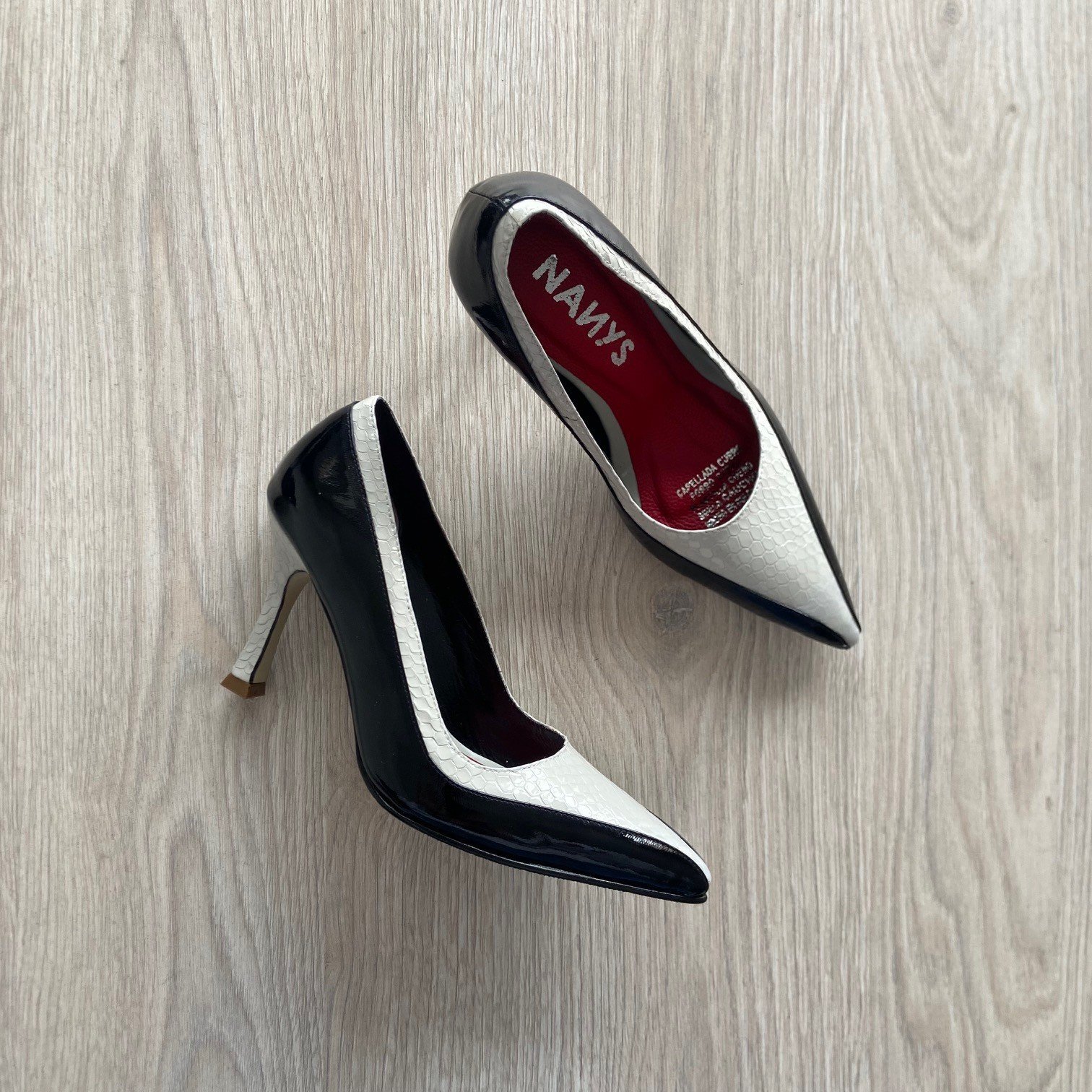 Zapatos clásicos cerrados negros con aplique blanco en cuero tipo charol. Tacón 7.5. Forrados en cuero. Hechos en Colombia.