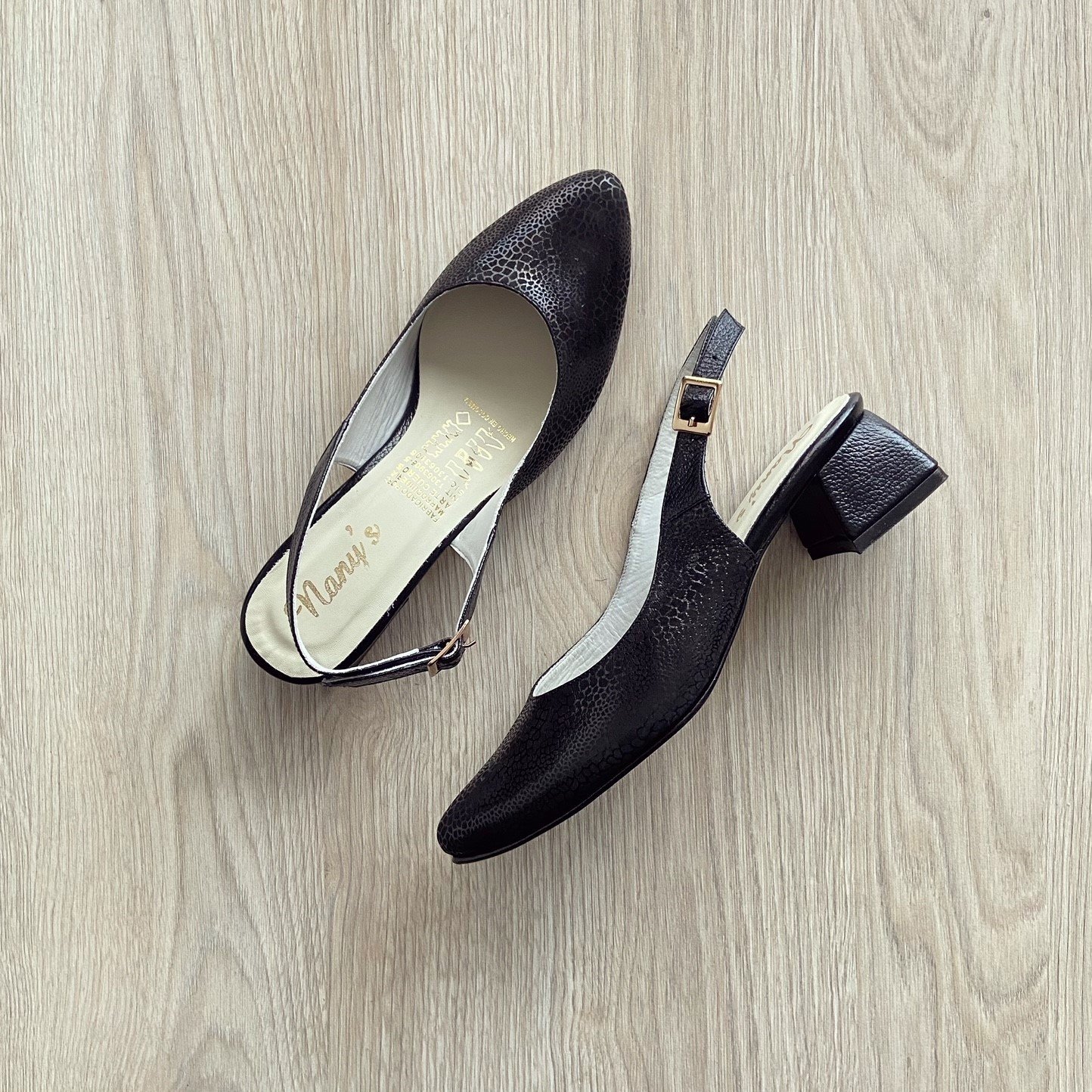 Zapatos negros en cuero bajitos. Tacón 3.5 cm. Destalonados con hebilla. Forrados en cuero. Hechos en Colombia.