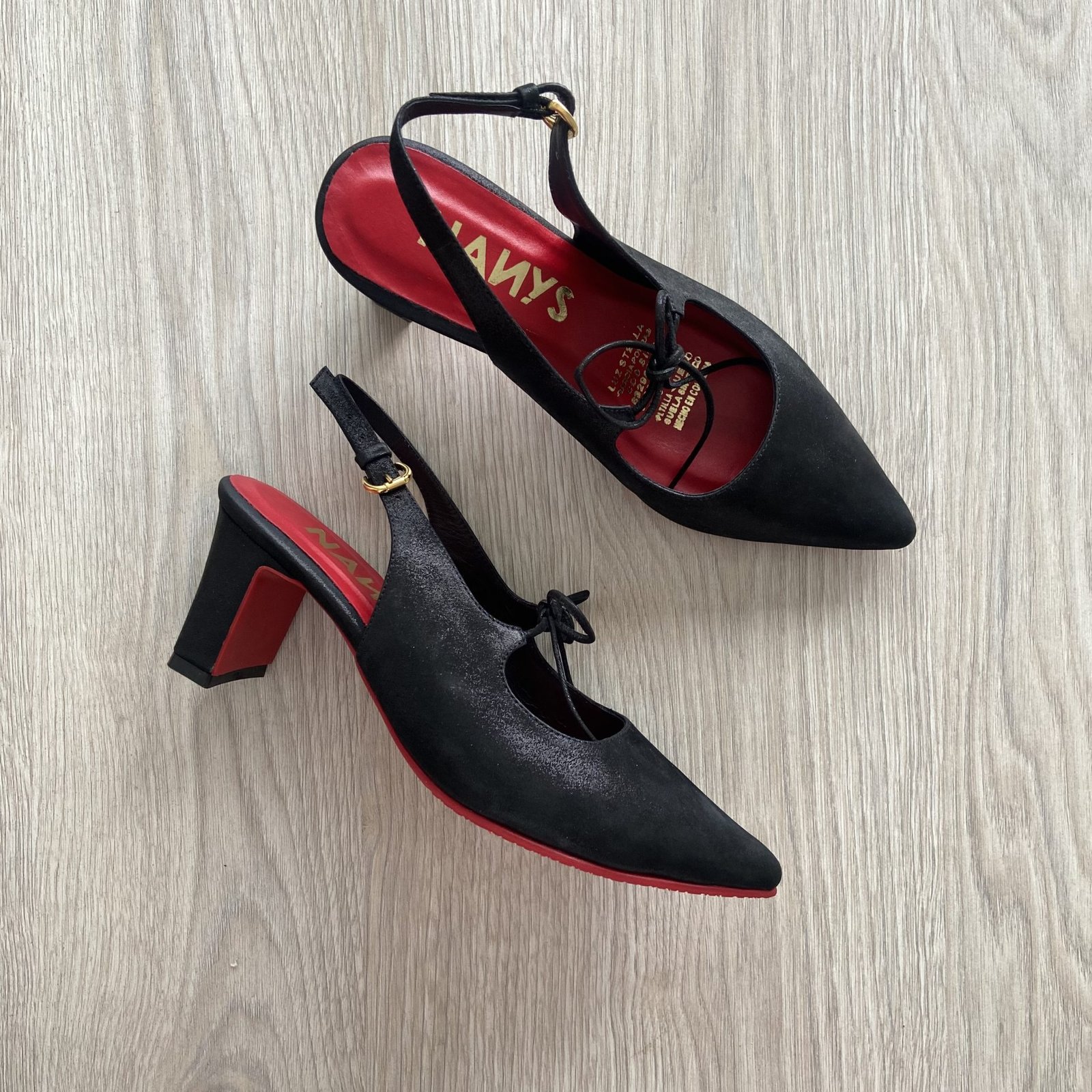 Zapatos negros en cuero con moño y hebilla. Tacón 5.5 cm. Suela roja antideslizante. Forrados en cuero. Hechos en Colombia.