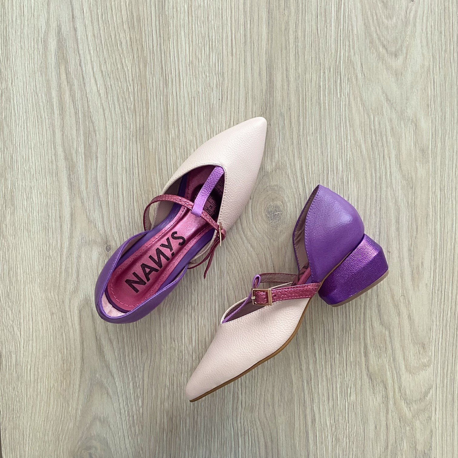 Zapatos palo rosa con morado y fucsia metalizado en cuero