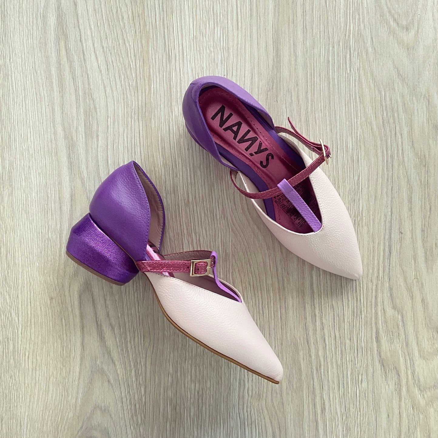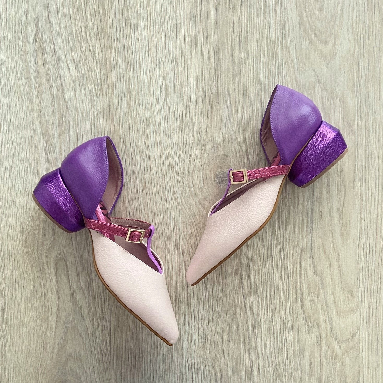 Zapatos palo rosa con morado y fucsia metalizado en cuero. Tacón 3.5 cm. Forrados en cuero. Hechos en Colombia.