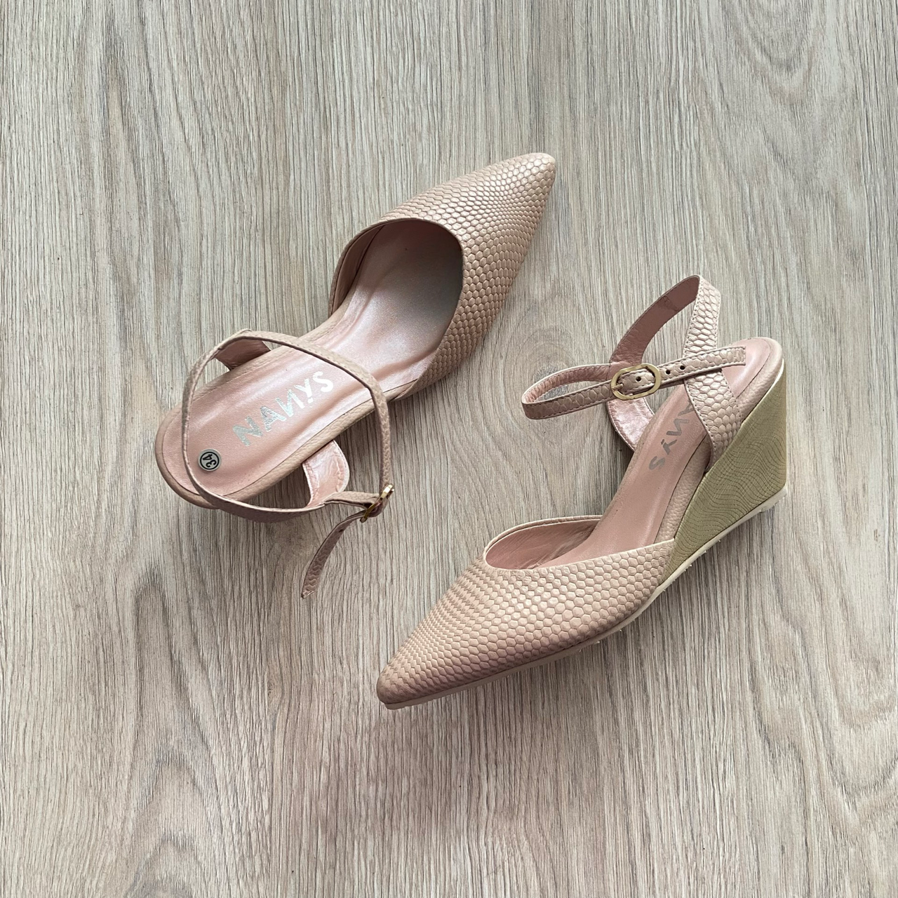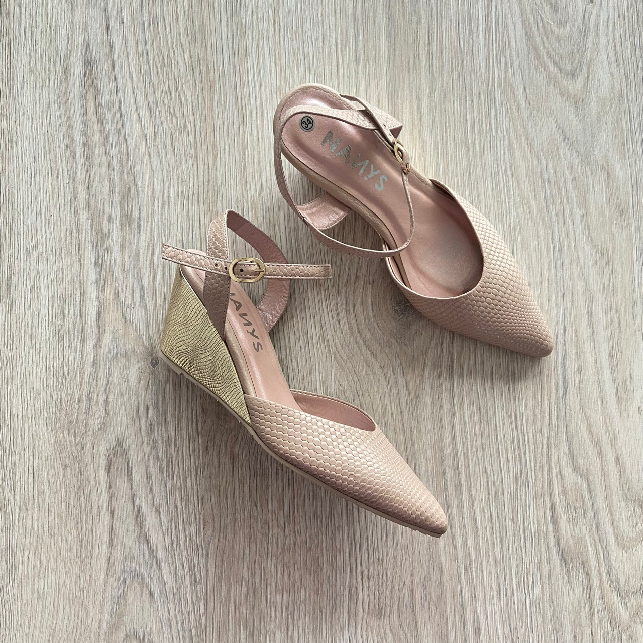 Zapatos palo rosa en cuero con tacón playa dorado. Tacón 5.5 cm. Forrados en cuero. Suela en goma antideslizante. Hechos en Colombia.