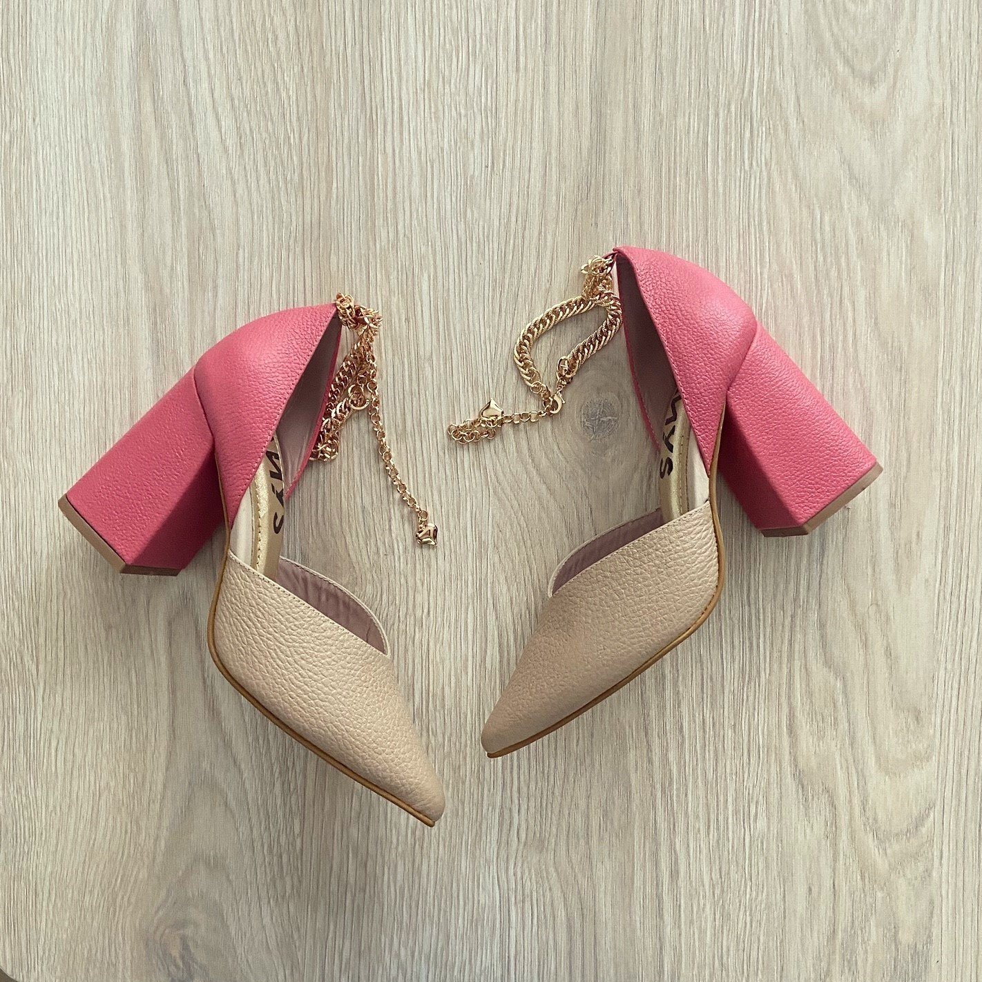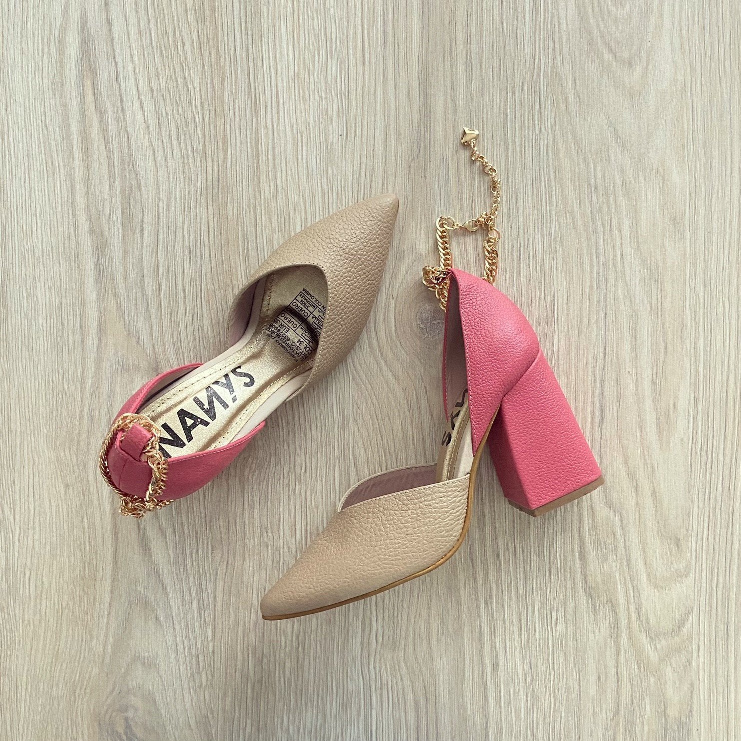 Zapatos taupe con salmón en cuero, con pulsera en cadena y accesorio en forma de corazón. Tacón 7.5 cm. Forrados en cuero. Hechos en Colombia.