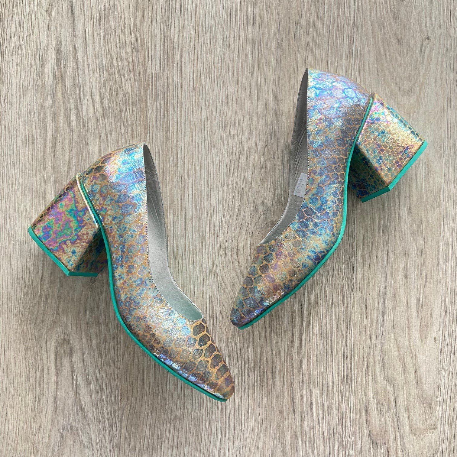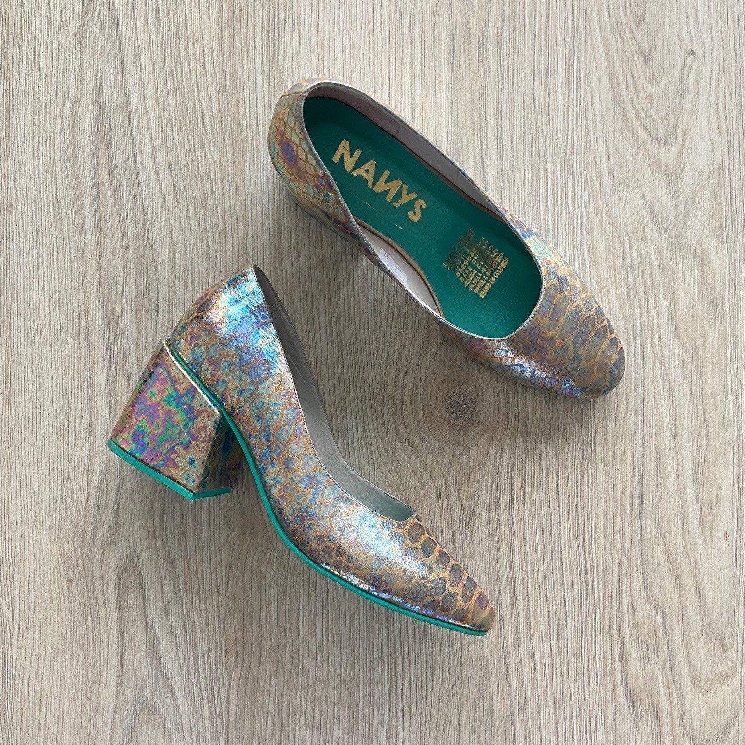 Zapatos tornasol en cuero. Tacón 5.5 cm. Suela verde en goma antideslizante. Forrados en cuero. Hechos en Colombia.
